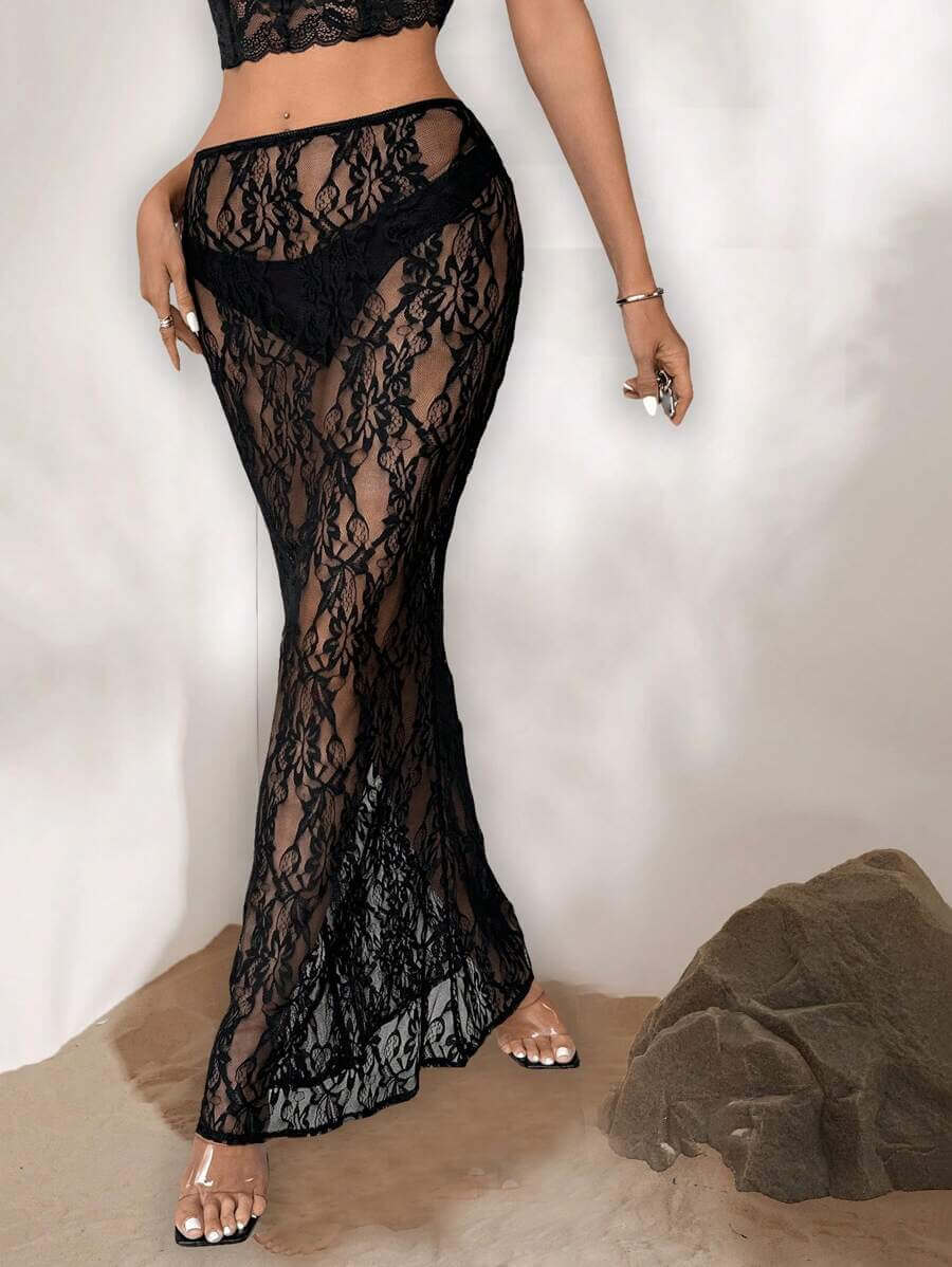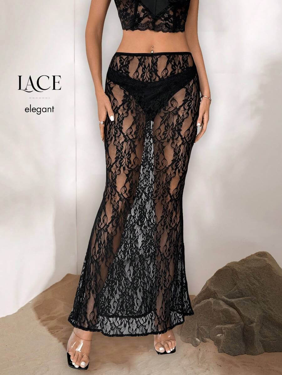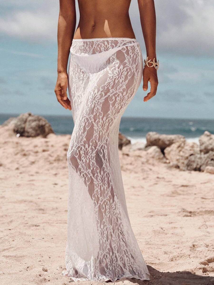 تنورة كاجوال بلون واحد من الدانتيل المحبوك مع خصر منخفض وحاشية حورية البحر،