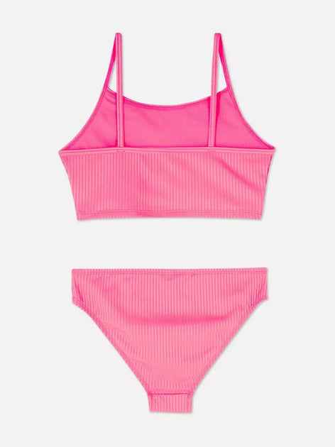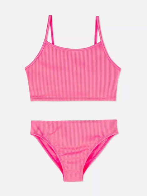 طقم سباحة بناتي بلون وردي زاهي بتصميم سادة بحمالات رفيعة