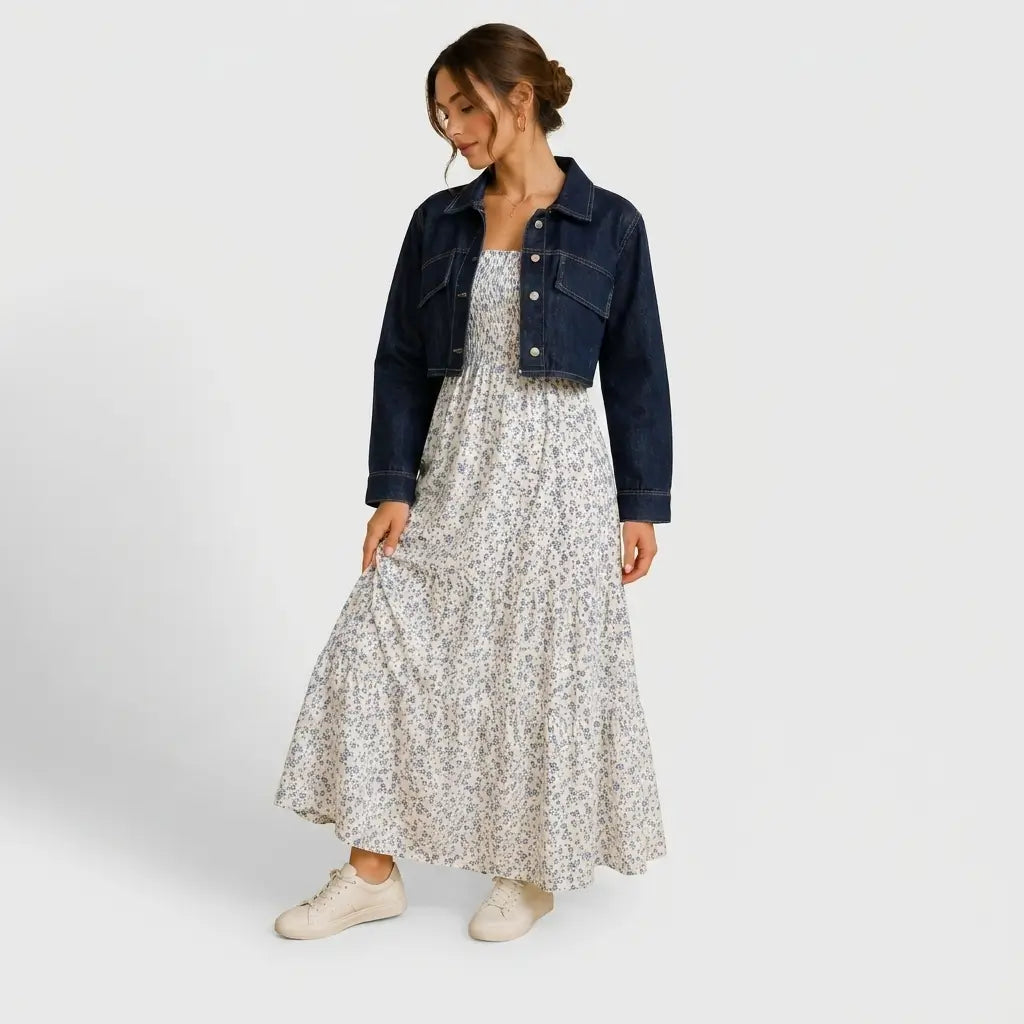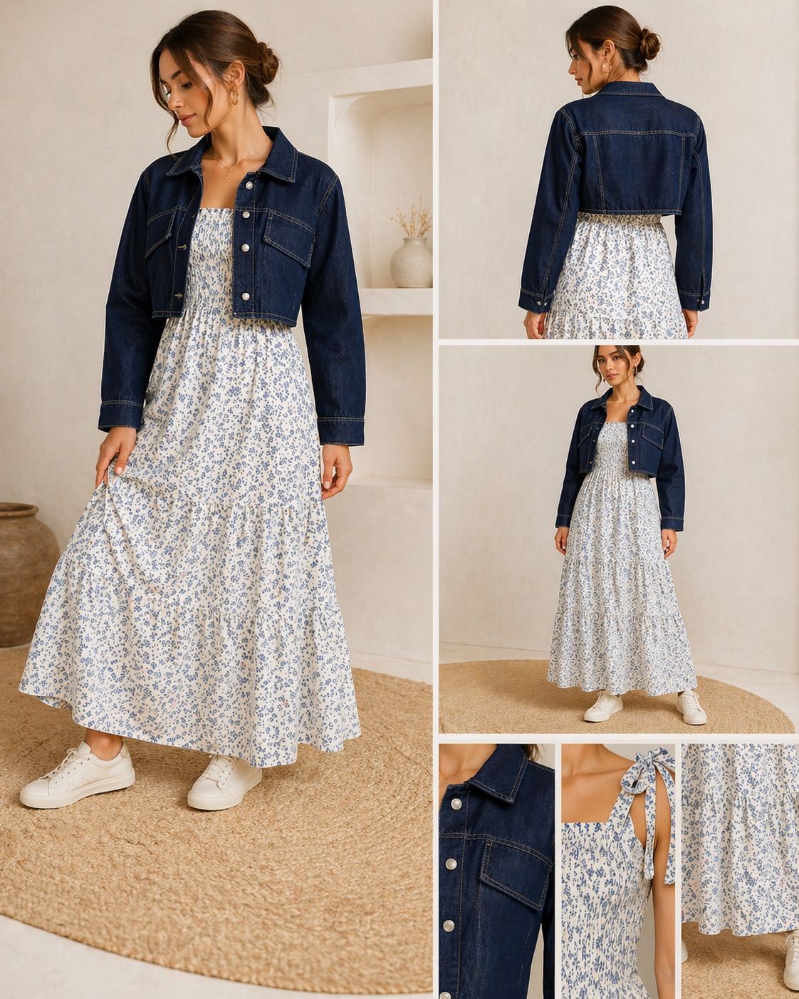 فستان ماكسي طويل مزين بنقوش الزهور الصغيرة وجاكيت دنيم قصير