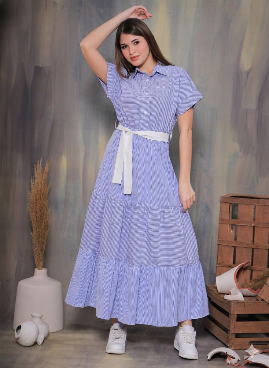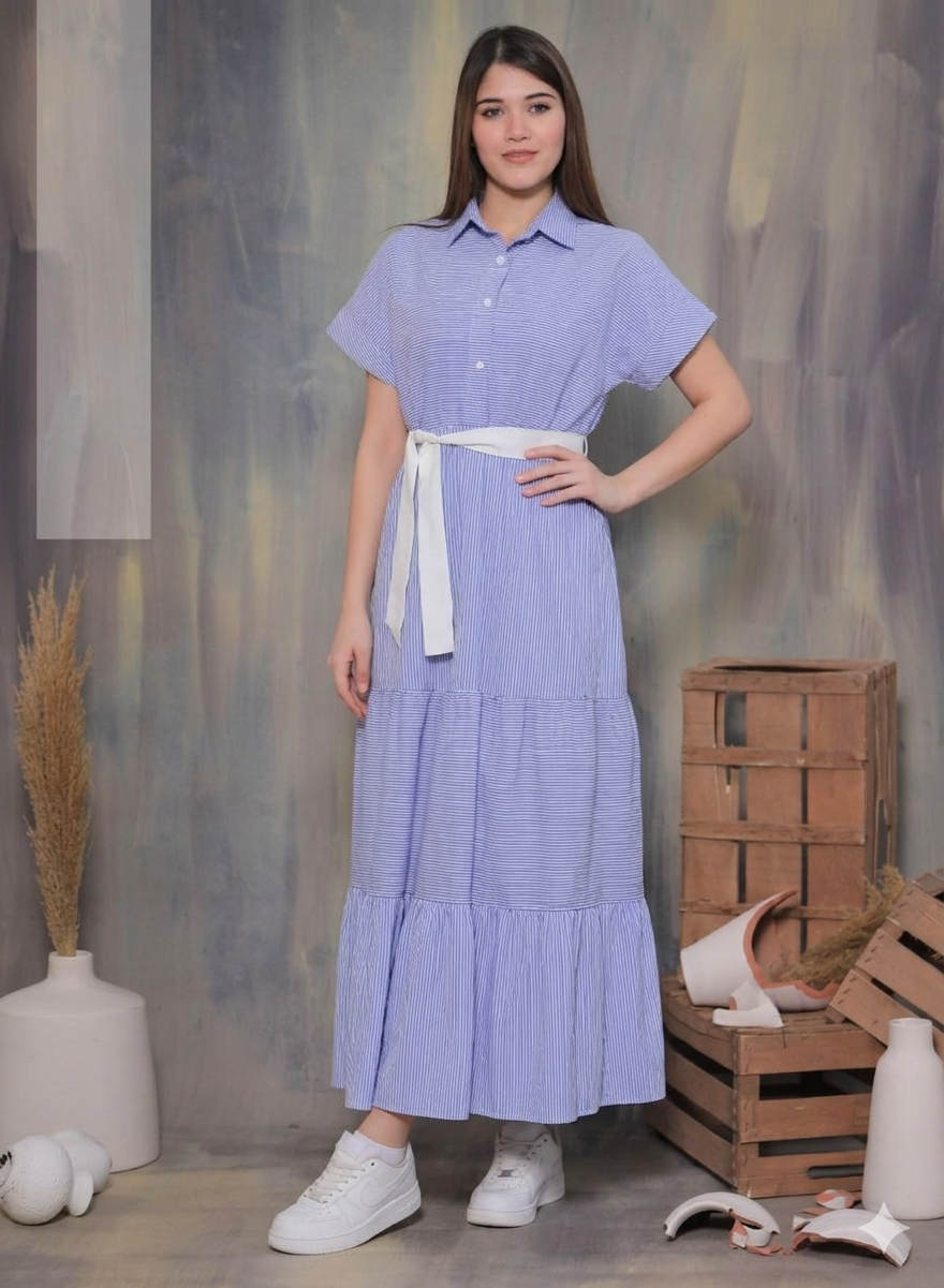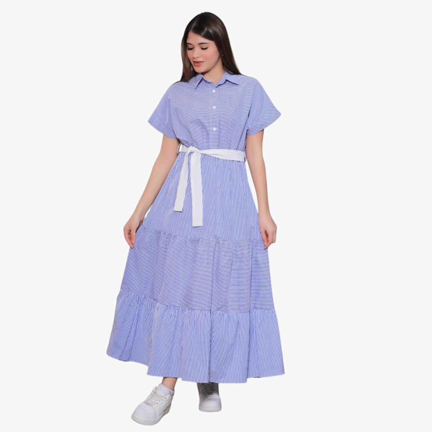 فستان نسائي صيفي مخطط أزرق وأبيض بدون أكمام