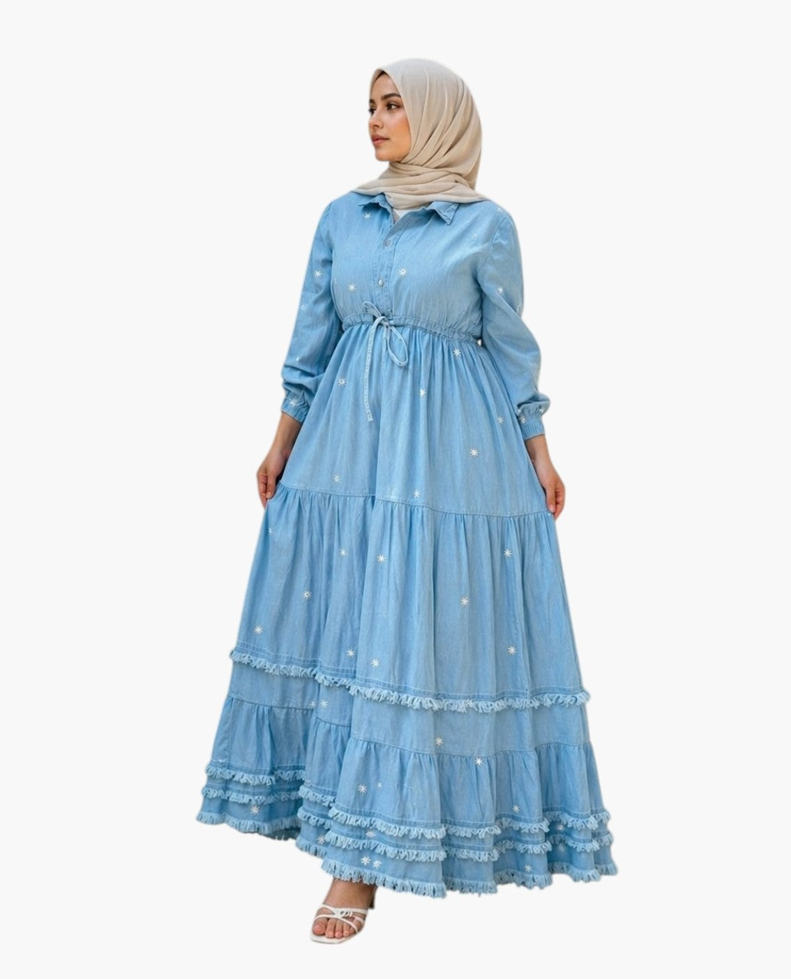 فستان دنيم كاجوال بتطريز زهري أنيق