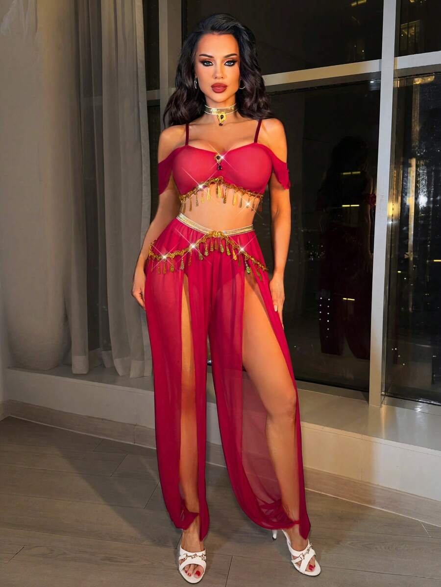 طقم 4 قطع مثير بترتر ذهبي مع بنطال بفتحة جانبية وسلسلة متدلية + تشوكر _ shein
