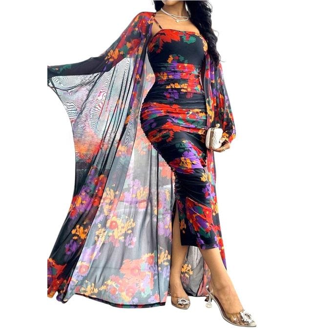 طقم SHEIN 3 قطع: فستان ماكسي شفاف بشراشيب ربطة فيونكة – إطلالة مثيرة أنثوية