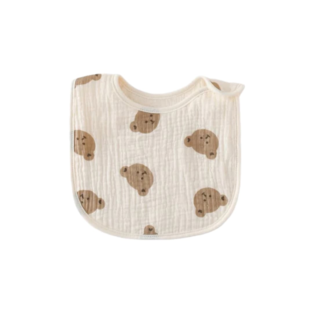 مريلة شاش قطني ناعمة وممتصة للرطوبة، مزينة بنقشة دببة لطيفة، مثالية للاستخدام اليومي أثناء التسنين أو الرضاعة أو تناول الطعام.