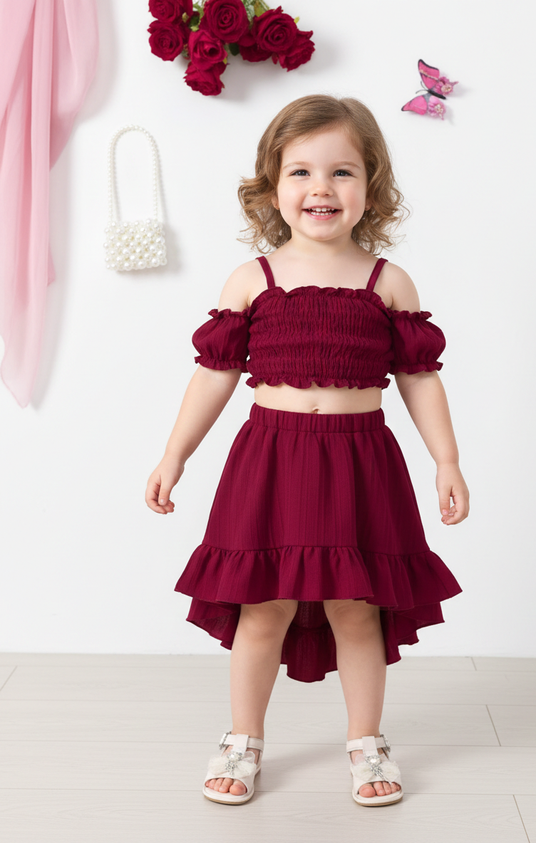 طقم لطيف للبنات باللون النبيتي الأنيق، يتكون من بلوزة قصيرة بأكتاف مكشوفة مع حمالات رفيعة وتنورة بكرانيش من الأسفل. الخامة خفيفة ومريحة على البشرة، مناسبة للأيام الصيفية أو النزهات. التصميم ناعم وبسيط مع لمسة بناتية تضيف أناقة وبراءة للإطلالة.