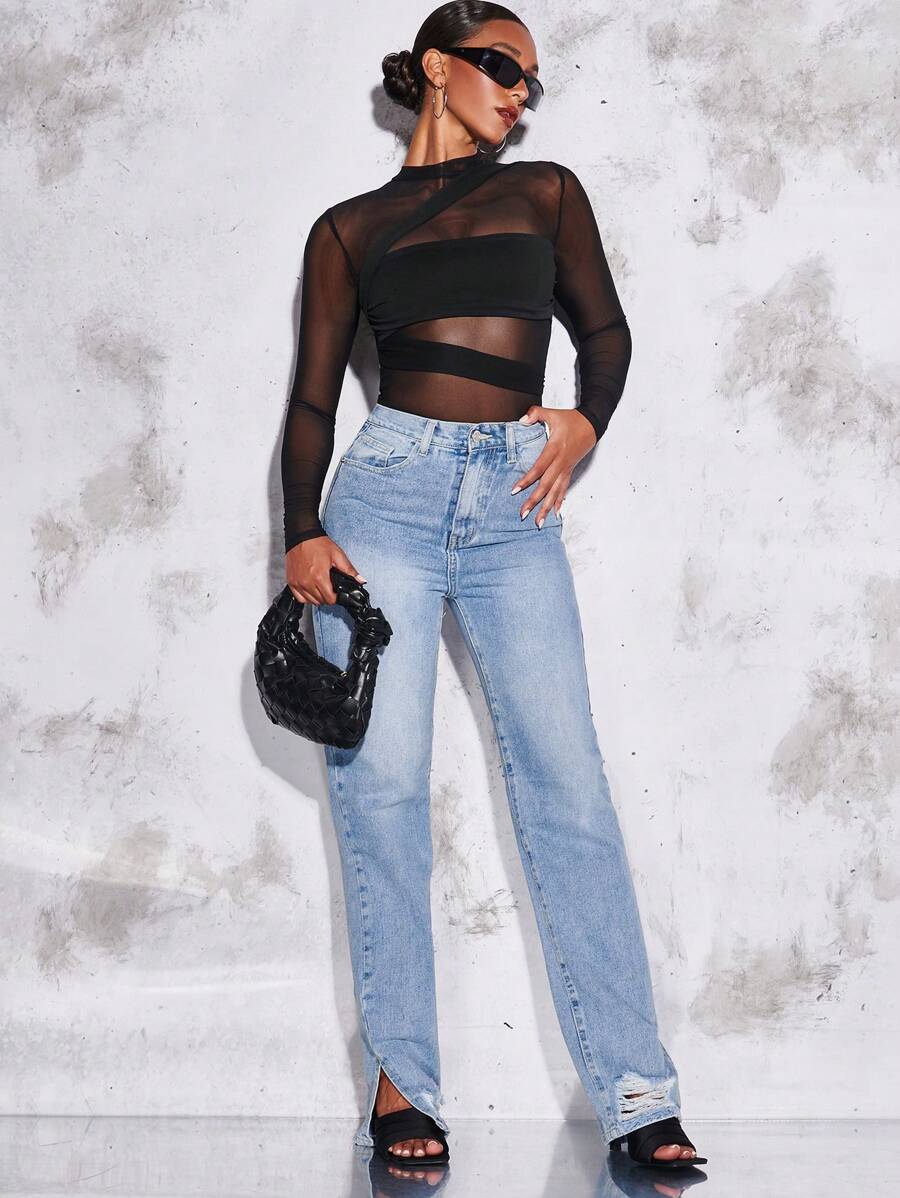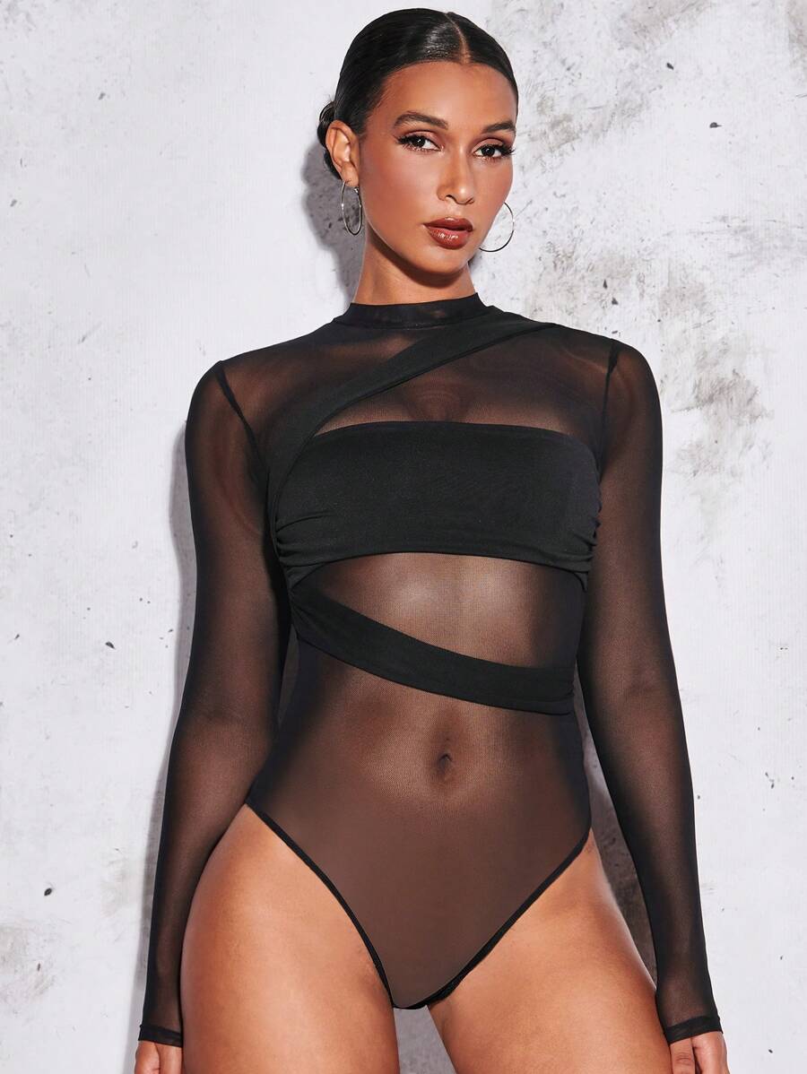 بدلة جسم Shein بدون حمالات مع كشكشة ورقبة عالية ولوحة شبكية