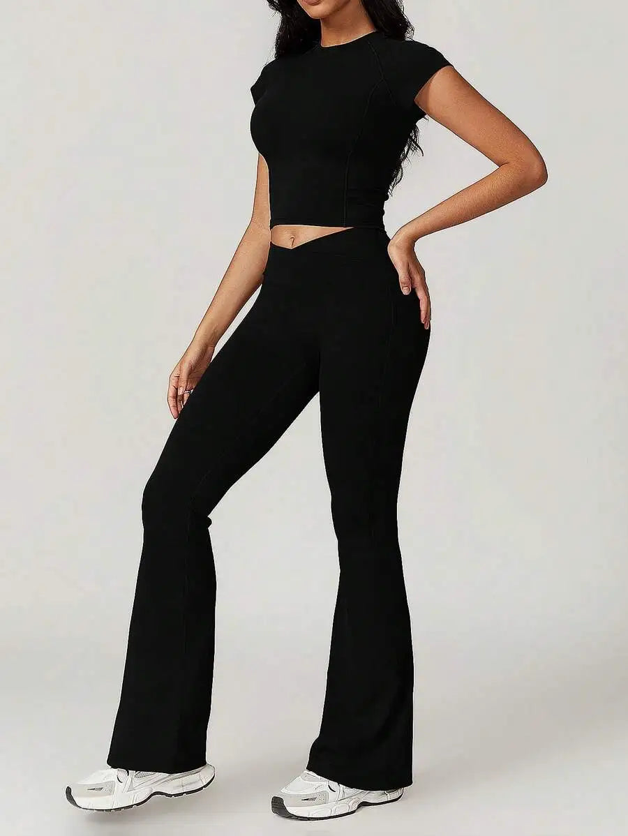 تتكون من توب بأكمام قصيرة بقصة عصرية مريحة، تمنحك حرية الحركة وتهوية مثالية، إلى جانب بنطال طويل بخصر مرتفع يعانق الجسم برفق ويوفر دعماً ممتازاً أثناء التمارين.