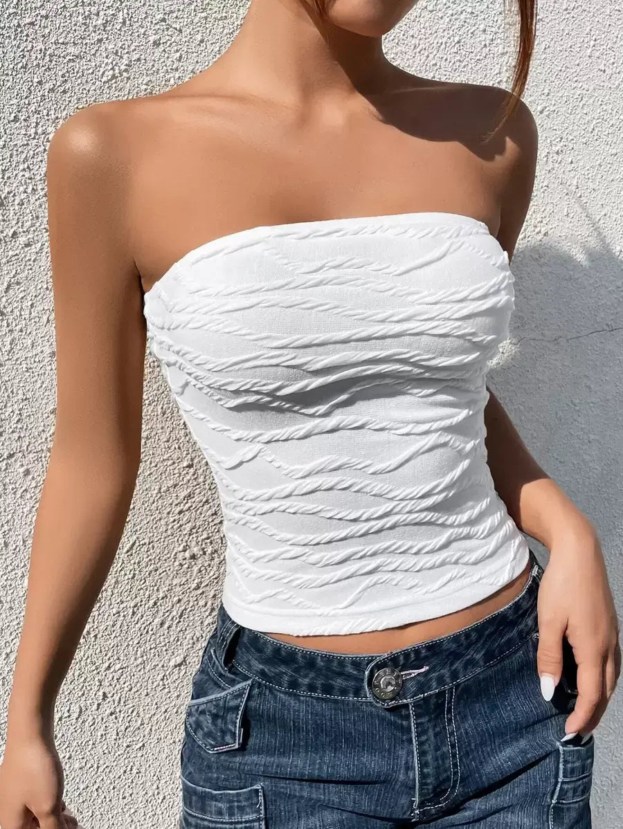 توب أبيض بخامة فيها تموجات خفيفة بتدي شكل مجعد بسيط. التصميم من غير حمالات، والخامة فيها مطاط خفيف يخليها ثابتة على الجسم. شكله بسيط ومناسب للأجواء الصيفية، وبيتنسق بسهولة مع بنطلون جينز أو شورت