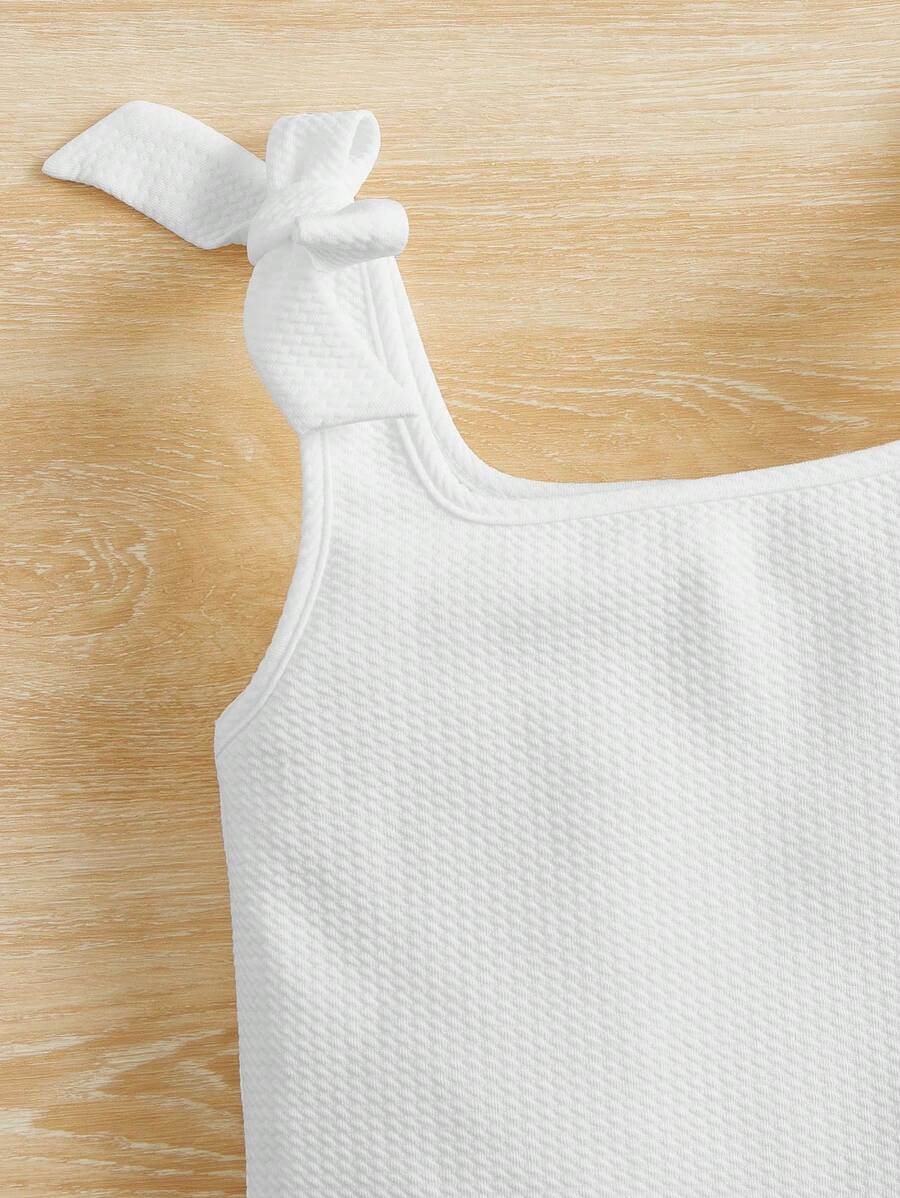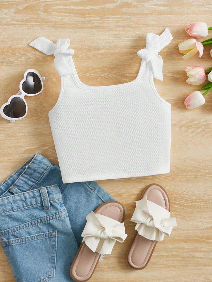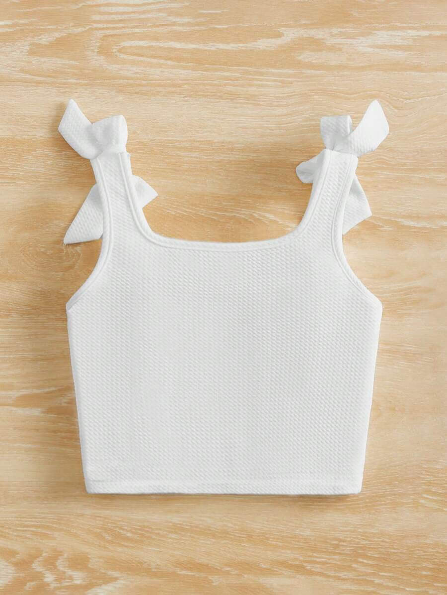 بلوزة تانك للبنات الصغيرات من SHEIN، بتصميم مربع أنيق وجذاب، مزينة بفيونكة من الجاكار، مناسبة للصيف