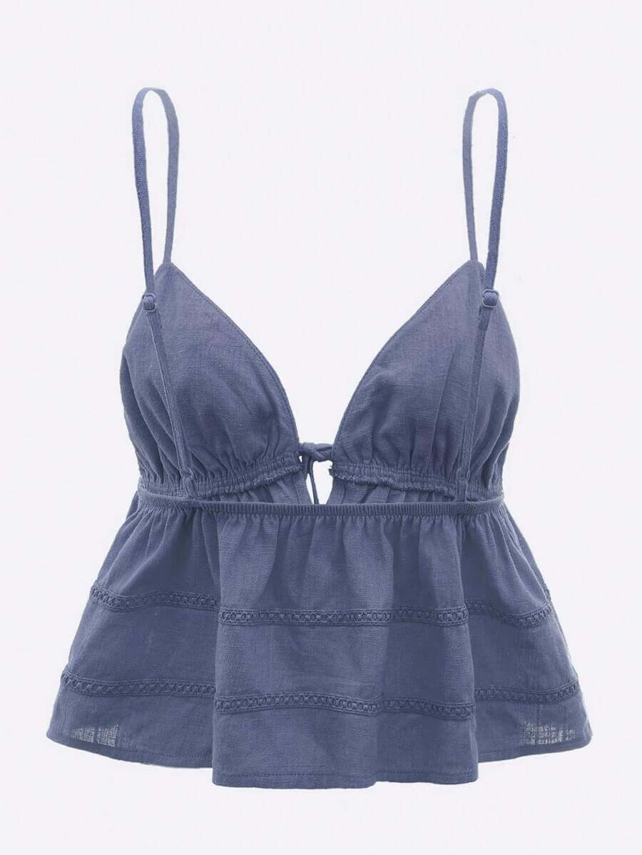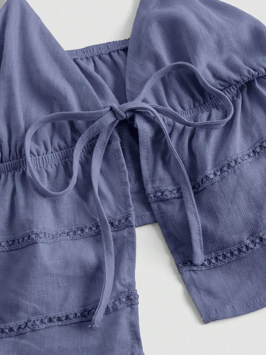 توب شي ان بخامه قطنية خفيفة بلون أزرق هادي، تصميمه بسيط بحمالات رفيعة وقَصّة واسعة من الأسفل بتدي شكل مريح وسهل في اللبس. التفاصيل الصغيرة في القماش والربطة الأمامية بتضيف لمسة ناعمة بدون مبالغة، وبيظهر كقطعة خفيفة مناسبة للأجواء الدافئة أو للاستخدام اليومي