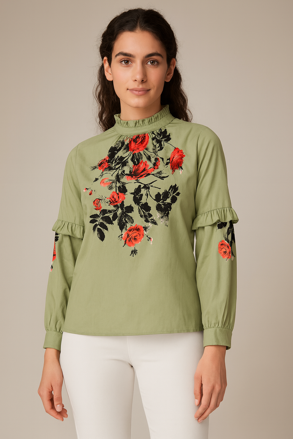 بلوزة مصنوعة من قماش خفيف بلون زيتي فاتح، مزينة بتطريز ورد أحمر وأسود في الجزء الأمامي وعلى الأكمام. تصميمها بسيط بياقة بكشكشة خفيفة وأكمام طويلة تنتهي بزر صغير. شكلها هادي ومتوازن،