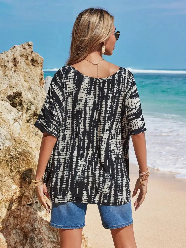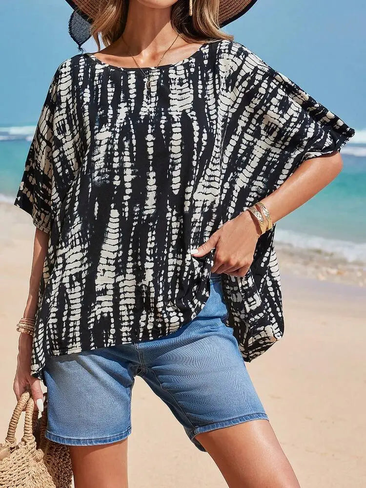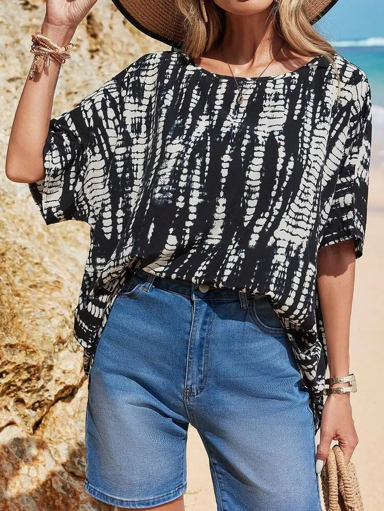 بلوزة نسائية أنيقة من Shein بتصميم عصري يجمع بين البساطة والراحة. تأتي باللون الأسود مع طبعات عشوائية باللون البيج تمنحها مظهرًا جذابًا ومميزًا. صُنعت من خامة بوليستر خفيفة وناعمة على الجسم، ما يجعلها خيارًا مثاليًا للارتداء اليومي في الأجواء المعتدلة. تصميمها الواسع مع الأكمام القصيرة الفضفاضة يضفي لمسة عملية ومريحة، بينما تضفي الياقة الدائرية لمسة كلاسيكية بسيطة