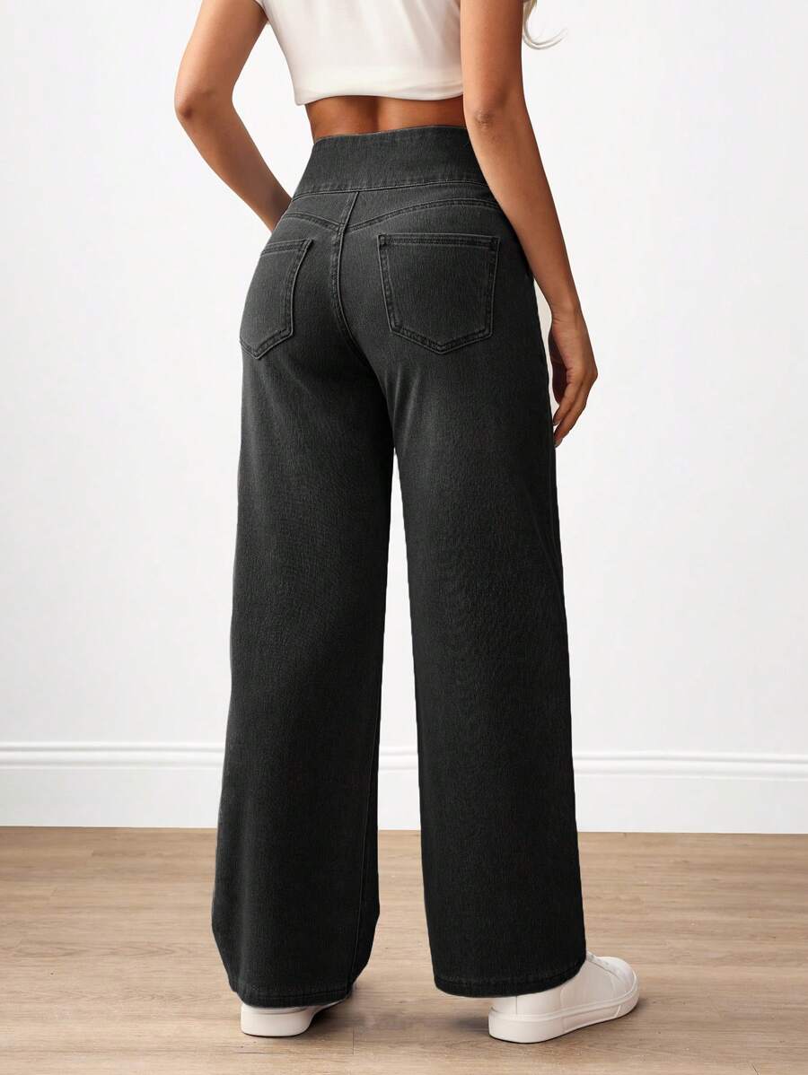 بنطال مصنوع من قماش جينز بلون أسود باهت بتصميم واسع من الساقين يمنح مظهر مريح وعصري. يتميز بخصر مرتفع بدون أزرار أو سحاب لسهولة الارتداء، مع جيوب جانبية عملية. القصة المستقيمة تجعله مناسب للتنسيق مع قطع بسيطة لإطلالة يومية متوازنة.