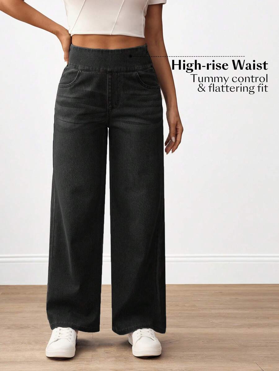 بنطلون جينز Flexra نسائي بخصر مرتفع وجيوب محبوكة واسعة الساق فضفاضة