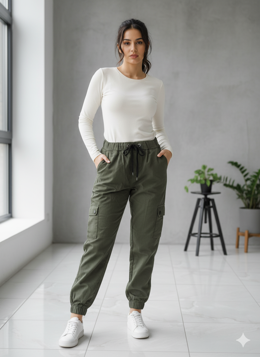 بنطلون كارجو بلون زيتي بتصميم عملي ومريح، خامته ثابتة وملمسها ناعم على الجسم. الموديل بيجمع بين الشكل الرياضي والكاجوال بخطوط بسيطة واضحة، مع خصر مطاطي ورباط أسود يسهّل ضبط المقاس. الجيوب الجانبية المربعة بتدي شكل عملي من غير أي تفاصيل زيادة، والمطاط عند القدمين بيحافظ على الشكل المستقيم للبنطلون.