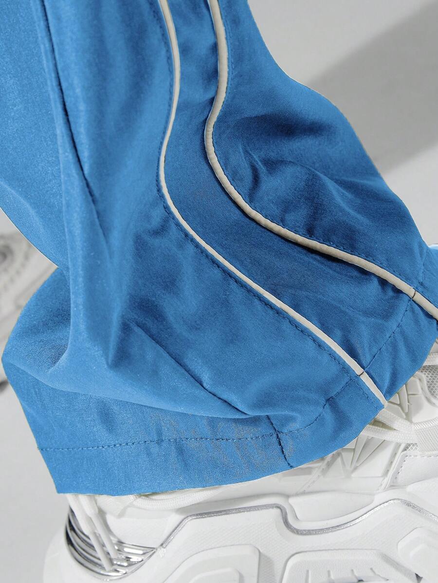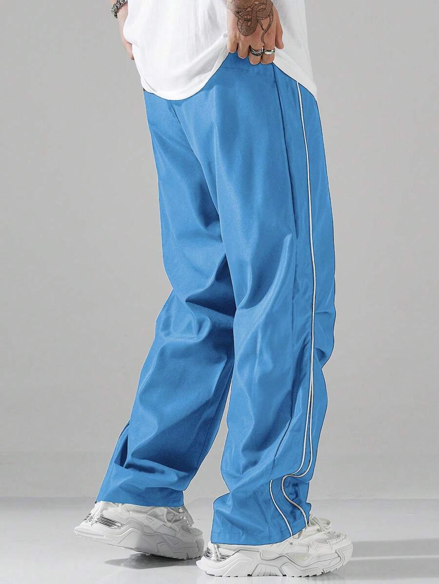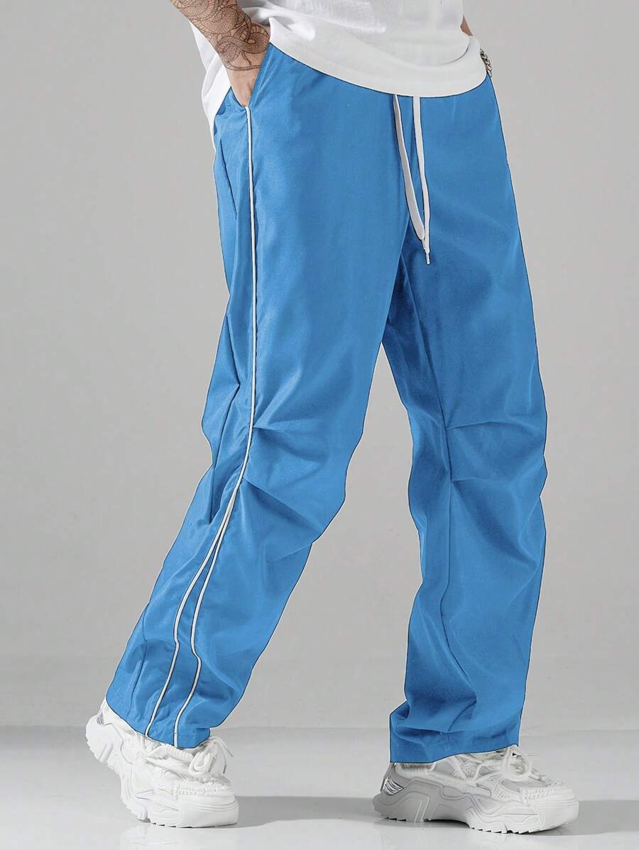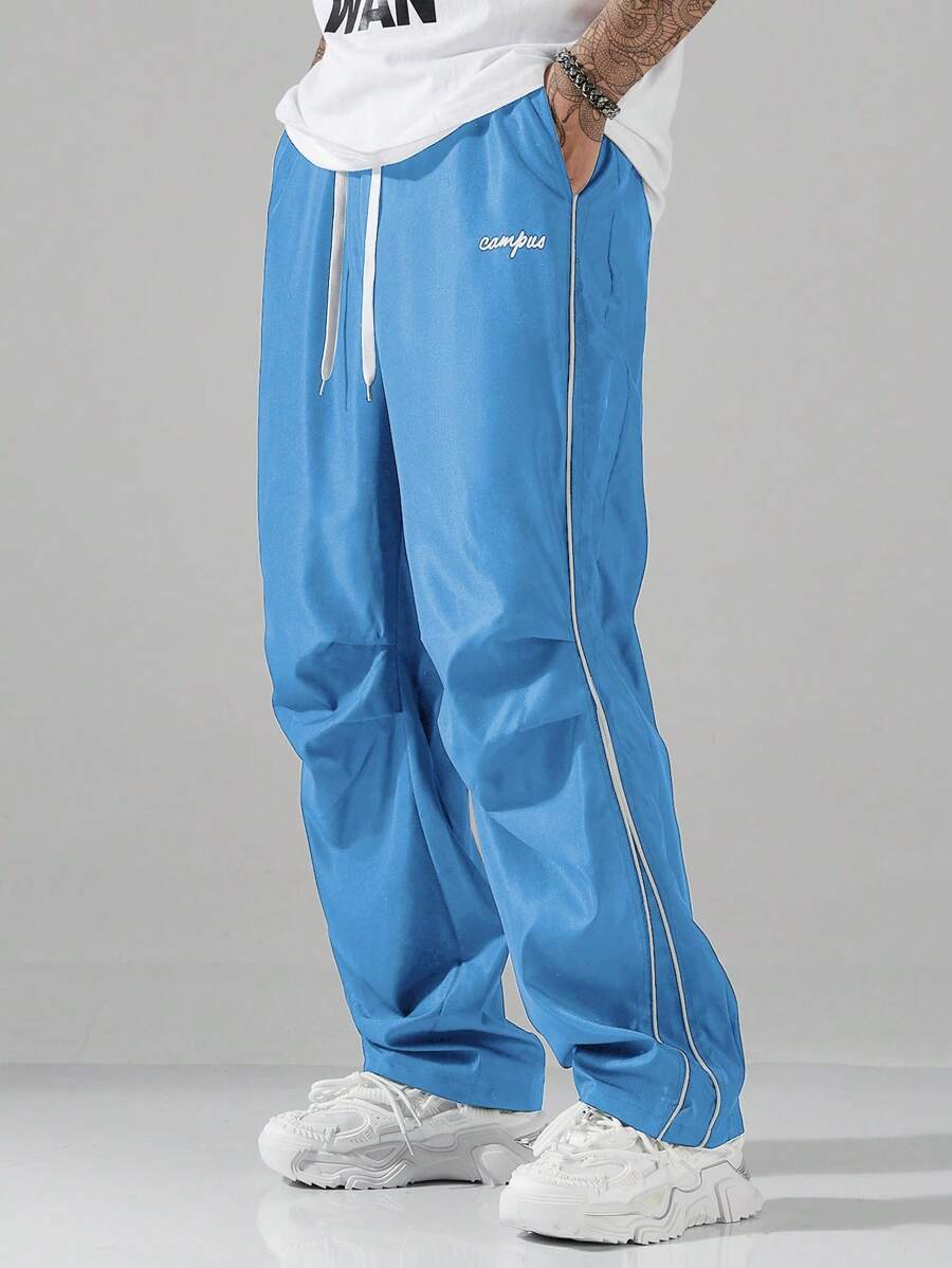 بنطلون رجالي باللون الأزرق بتصميم فضفاض مريح مستوحى من الستايل الجامعي. الخامة خفيفة ومناسبة للأجواء المتوسطة، ويتميز بخط جانبي بلون متباين مع حبل ربط في الخصر. تصميمه بسيط ويمكن تنسيقه بسهولة مع تيشيرتات أو سويتشيرت خفيفة.