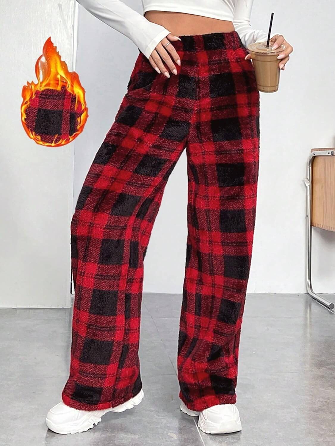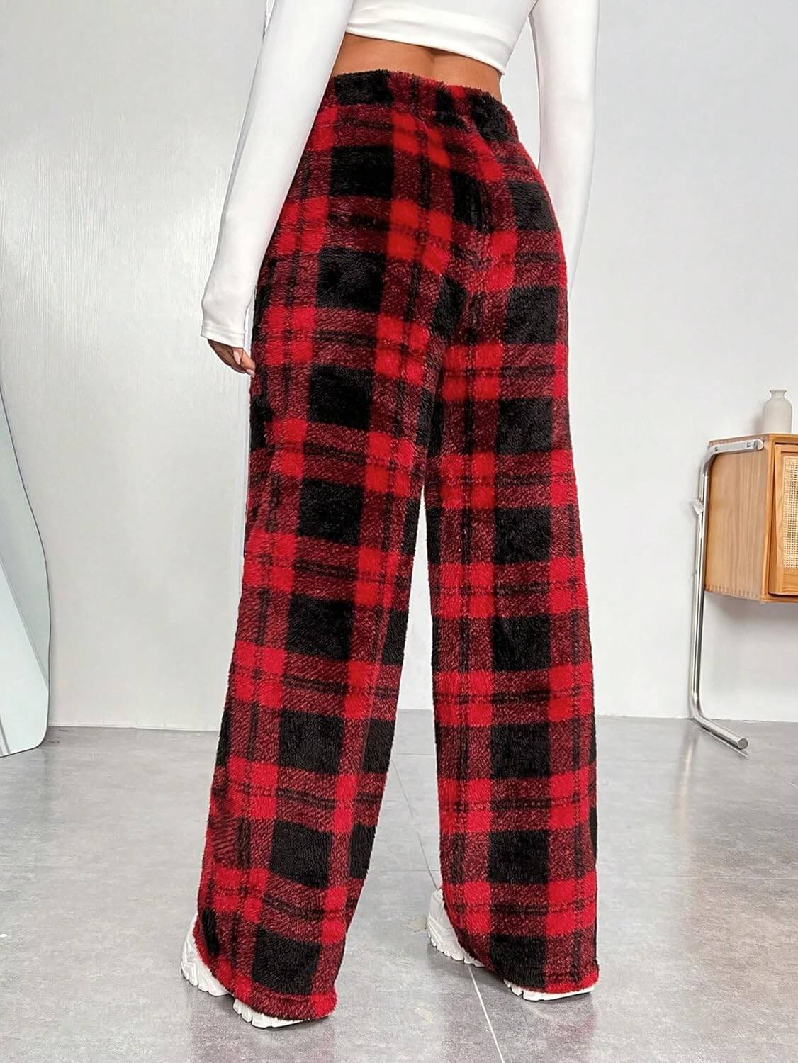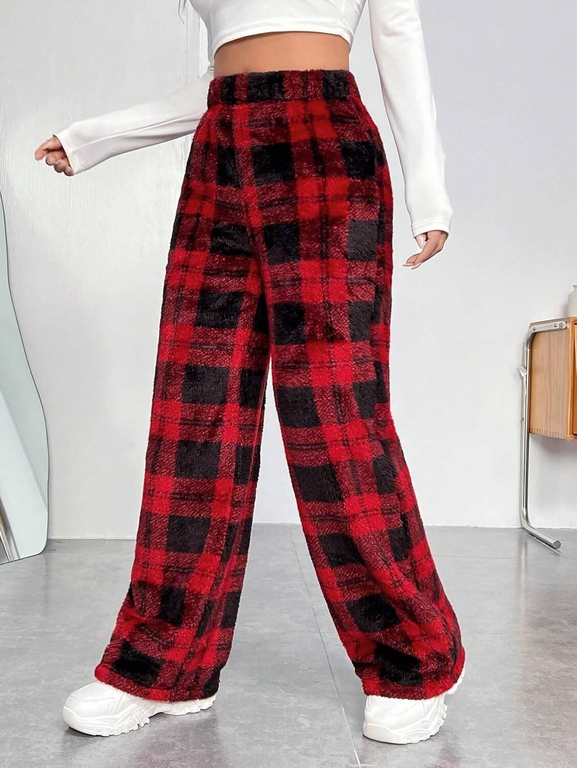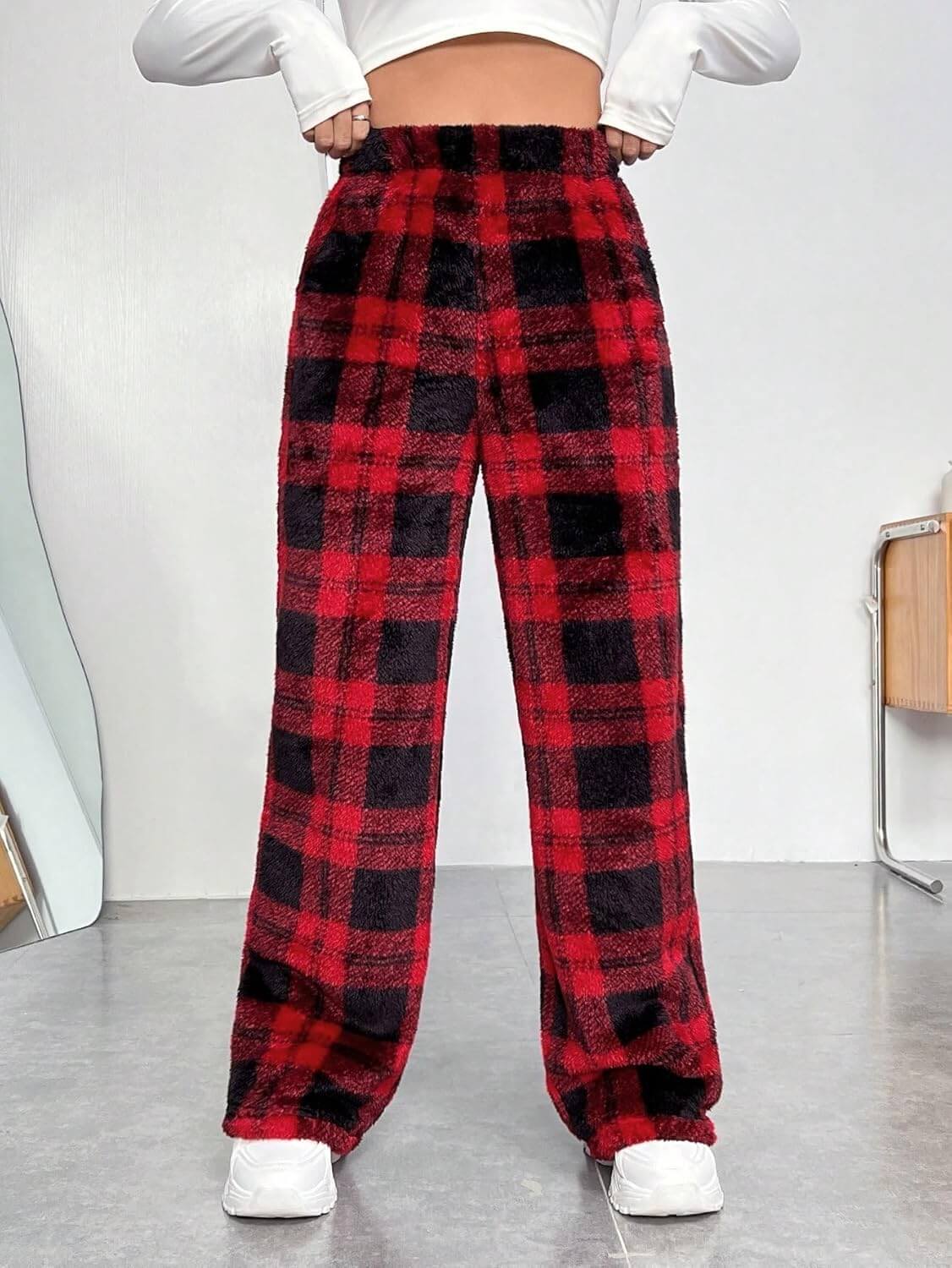 بنطالًا واسع الأرجل بنقشة مربعات (كاروهات) باللونين الأحمر والأسود. البنطال يبدو من قماش ناعم ومريح، مثل الفلانيل أو المخمل، مما يجعله مناسبًا للأجواء الباردة أو للارتداء المنزلي. الجزء العلوي الذي ترتديه المرأة هو بلوزة بيضاء طويلة الأكمام ومكشوفة البطن. الحذاء أبيض وذو نعل سميك، مما يُكمل الإطلالة العصرية والمريحة.