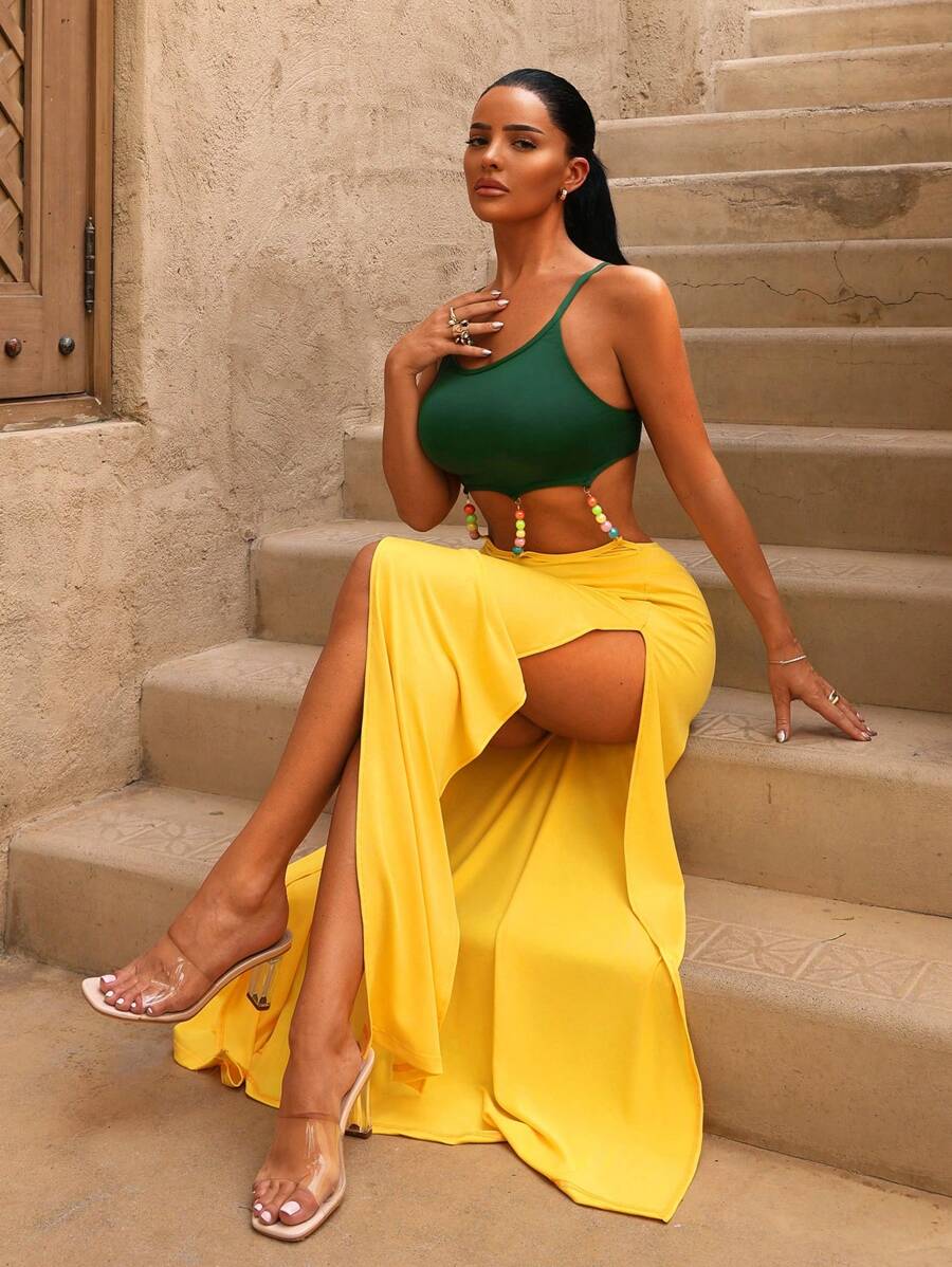 بودي سوت نسائي من INAWLY بدون أكمام بلون سادة وتصميم مجمّع ضيّق