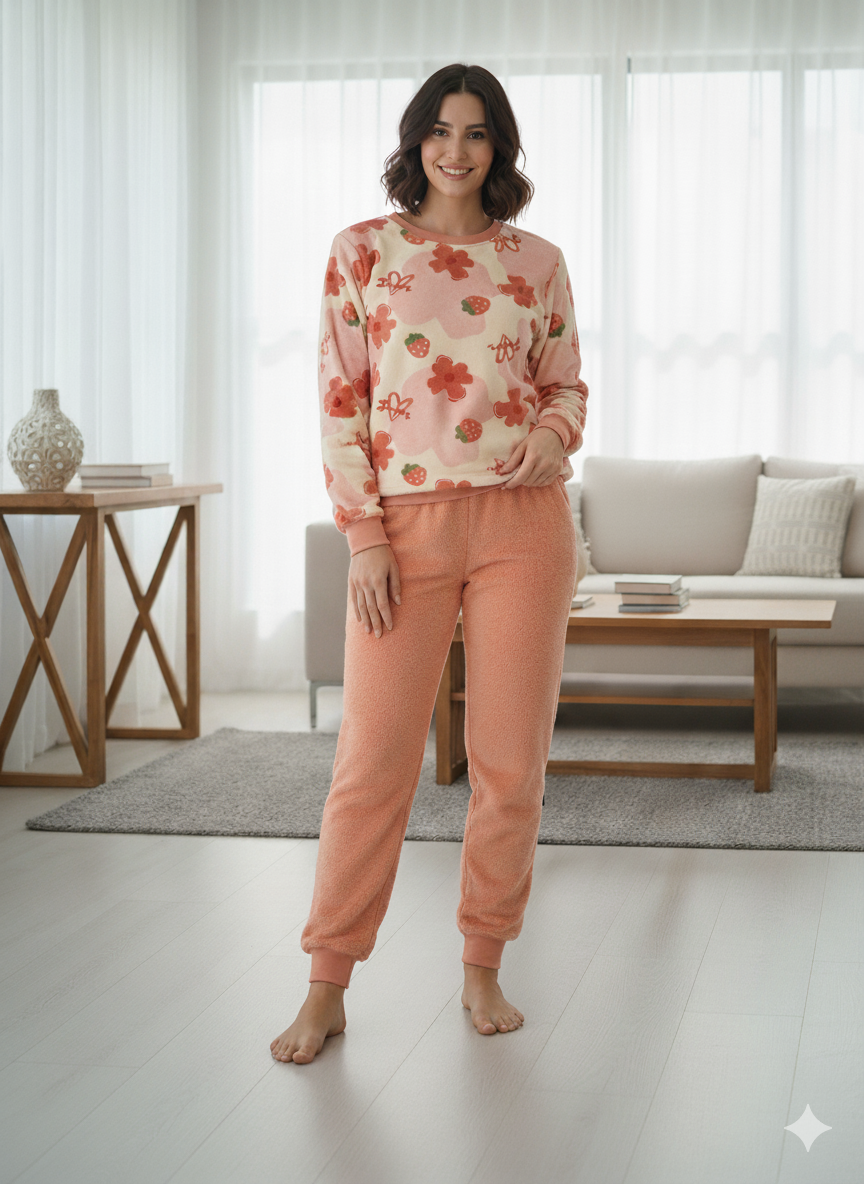 بيجامه مصنوعة من خامة فليز ناعمة جدًا على البشرة، بتدي إحساس دفا وراحة طول اليوم. التيشيرت طويل الأكمام عليه نقشة فراولة وزهور بألوان أنثوية رقيقة، والبنطلون بلون موحد ومقلم عند الأطراف علشان الإطلالة تكون متناسقة وشيك. مثالية لأوقات الاسترخاء أو قبل النوم في الأيام الباردة.
