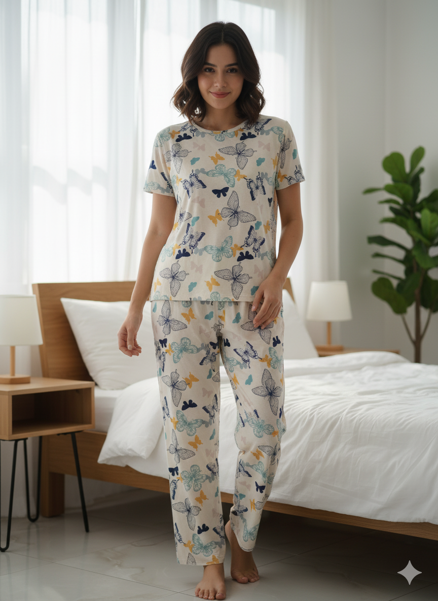 بيچامة مصنوعة من قماش قطني ناعم بملمس خفيف على البشرة، ومزينة بنقشة فراشات بألوان هادية تضيف لمسة أنثوية لطيفة. تصميمها الواسع بيخليك تتحركي براحتك سواء وقت النوم أو الاسترخاء في البيت، ومناسبة جدًا للأيام الصيفية الدافئة.