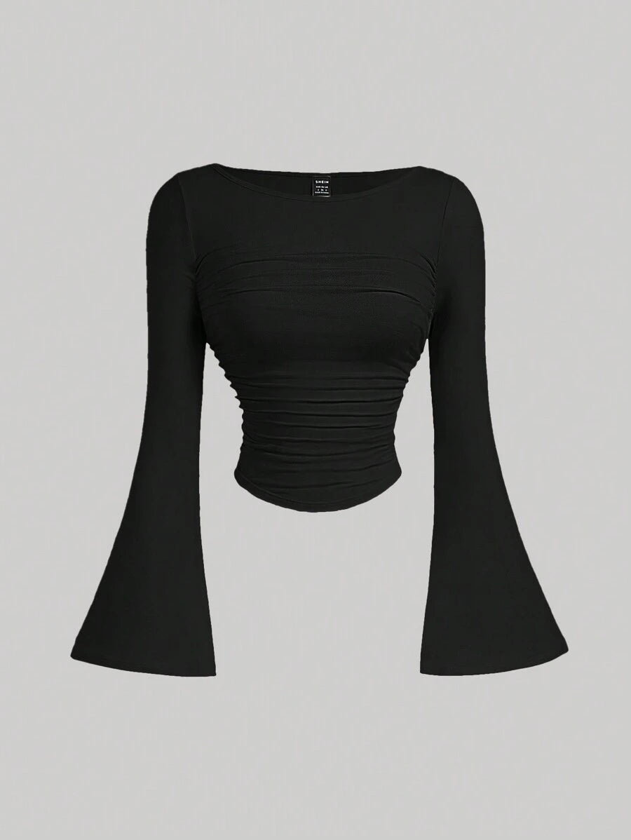احصلي على إطلالة أنيقة وعصرية مع هذا التوب النسائي من SHEIN MOD. يتميز برقبة قارب (Boat Neck) تضيف لمسة كلاسيكية، أكمام واسعة (Bell Sleeve) لإطلالة ديناميكية وأنيقة، وخصر مجمّد (Ruched Waist) يبرز القوام بشكل أنثوي.
