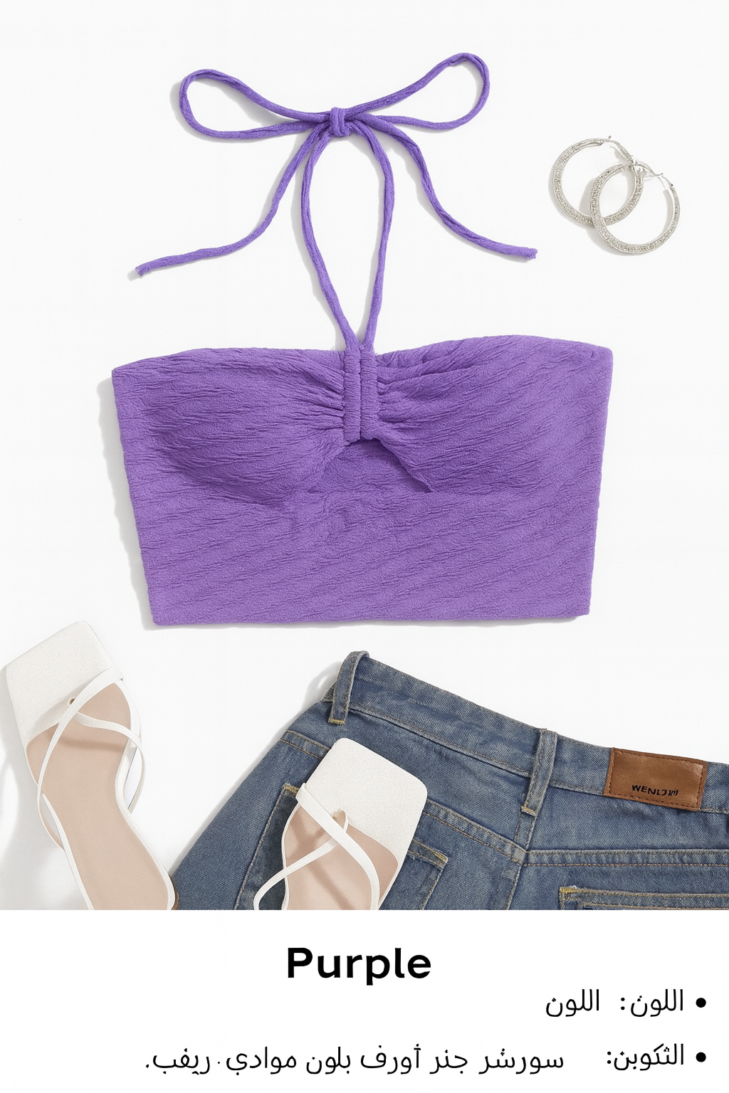 توب قصير بتصميم هالتر مجعّد ولون بنفسجي هادئ، يعطي إحساس صيفي منعش ومريح. تصميم الربطة خلف الرقبة مع التجميعة الأمامية يضيف لمسة أنثوية بسيطة، وخامته الخفيفة تجعله مناسب للإطلالات الكاجوال في الجو الدافئ.