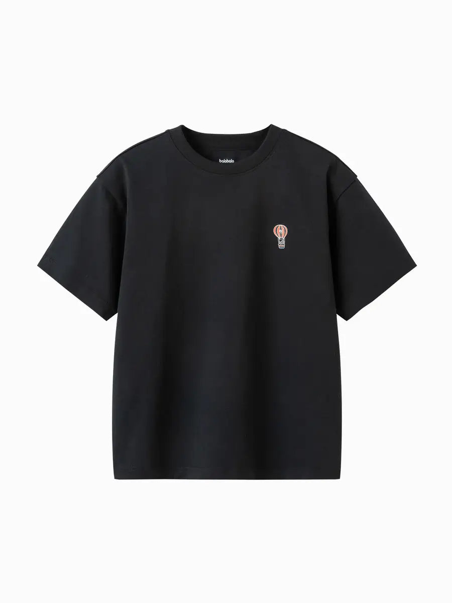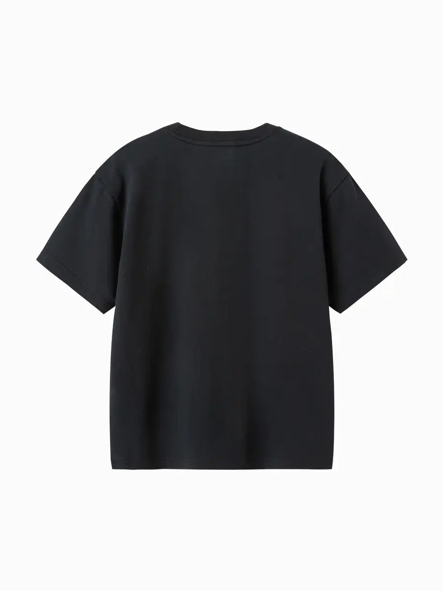 تيشيرت أسود كلاسيكي بتصميم بسيط وعصري. يتميز بقصة مريحة وأكمام قصيرة، مع طباعة صغيرة وملونة على الجهة اليسرى من الصدر،