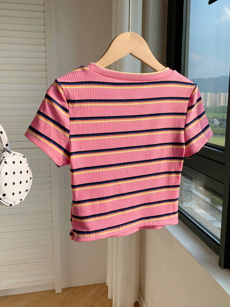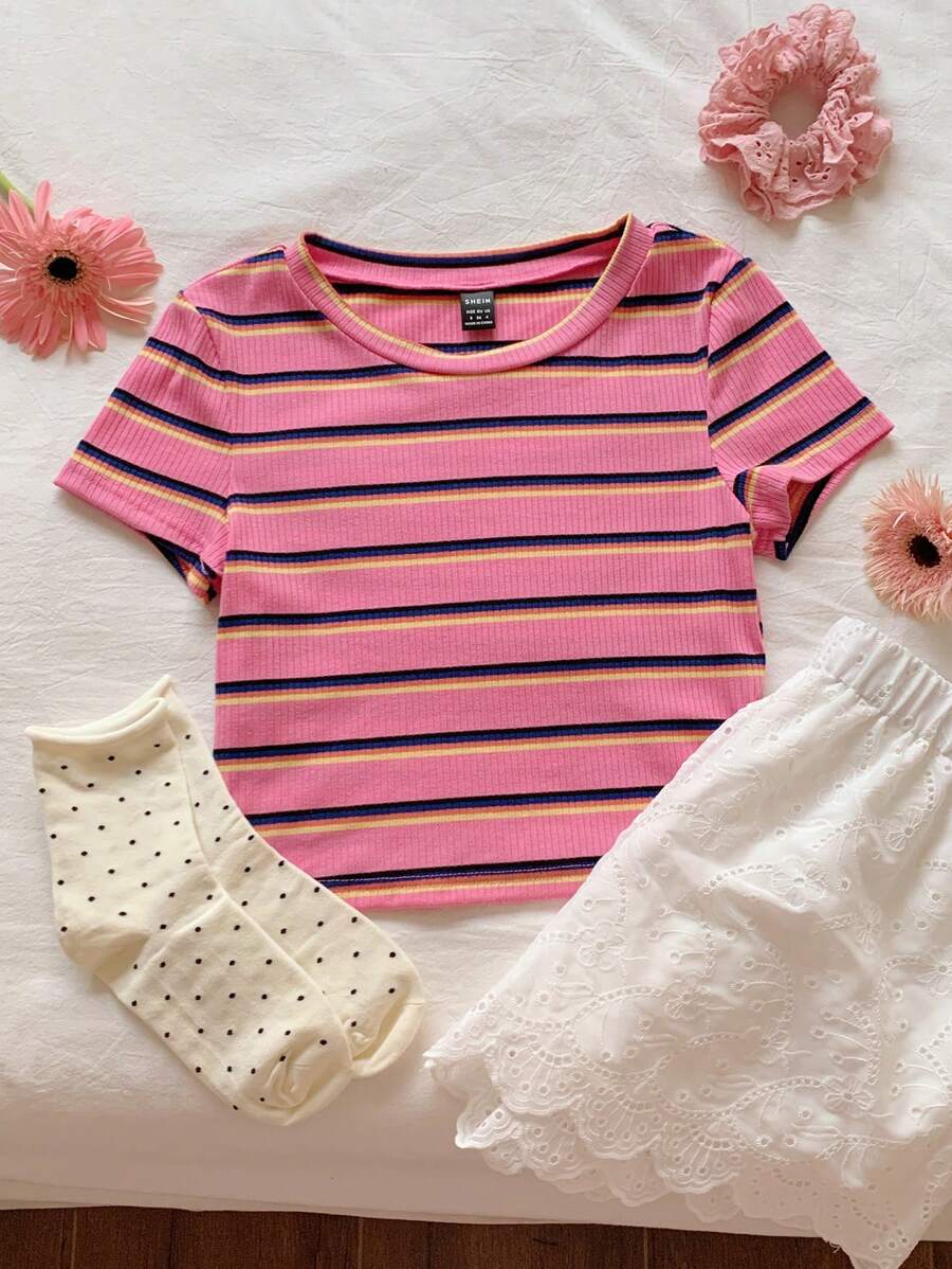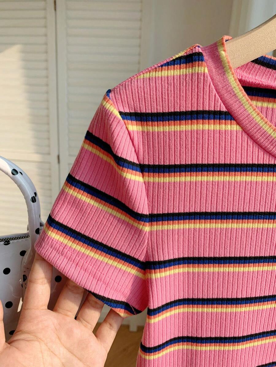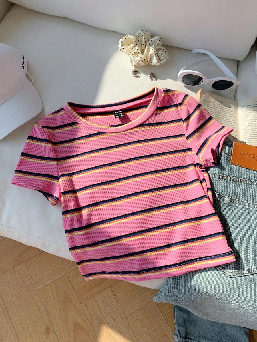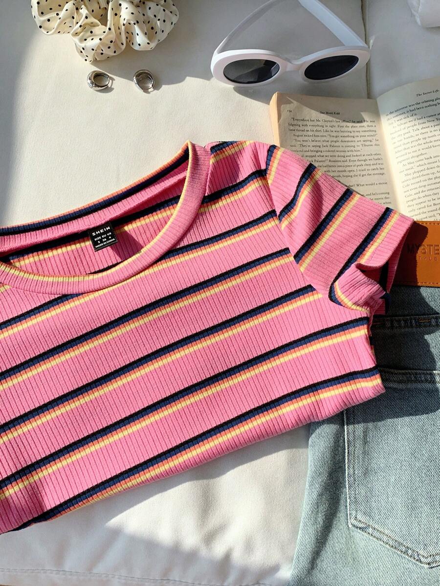 تيشيرت نسائي محبوك بخطوط ملوّنة – تصميم ضيّق عصري