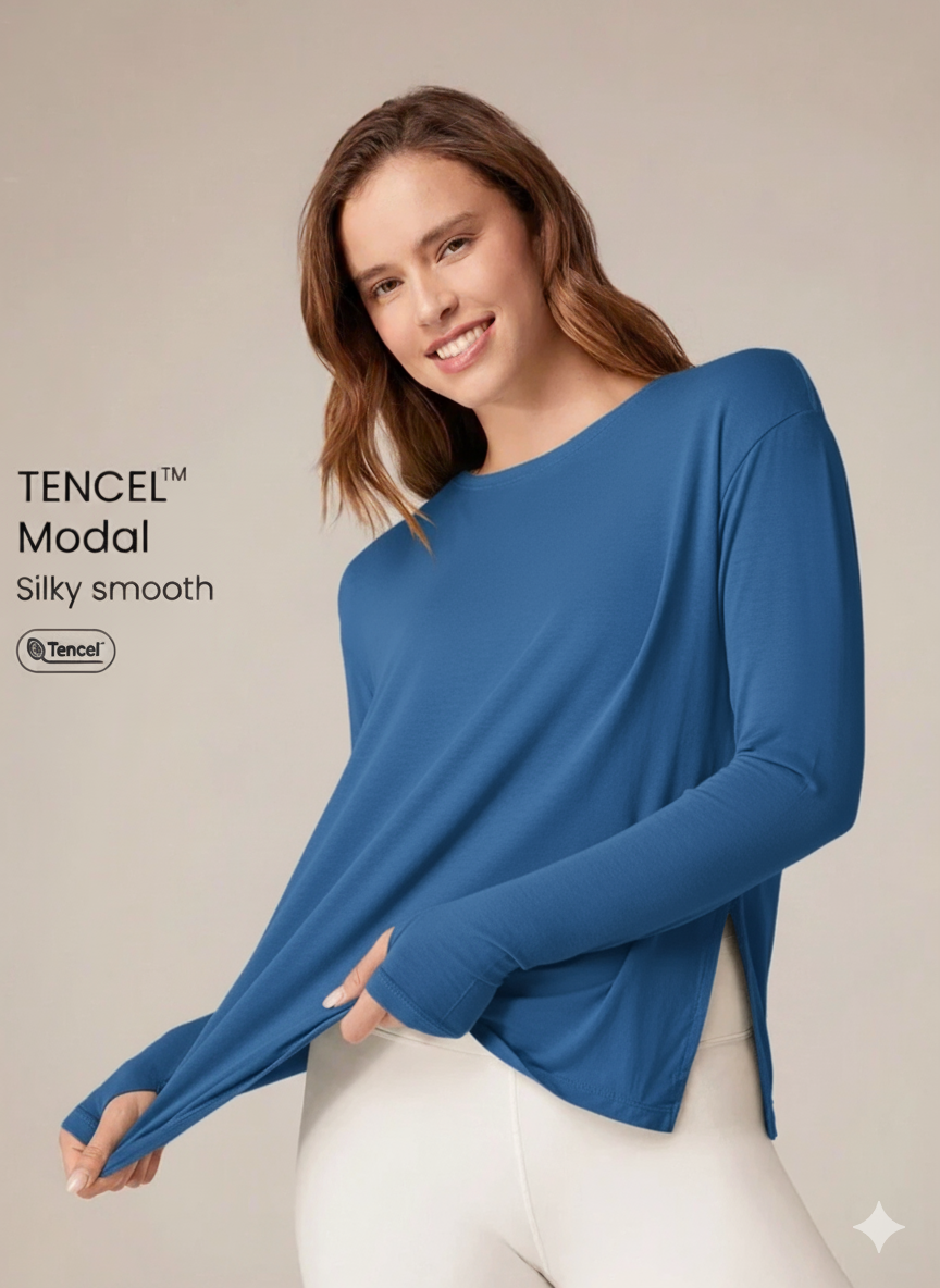 تي شيرت رياضي  أنيق بتصميم بسيط ومريح، مصنوع من خامة المودال الناعمة التي تمنح ملمسًا حريريًا وانسيابية في الحركة. يأتي بقَصّة فضفاضة قليلاً وأكمام طويلة مع فتحات خفيفة عند الجانبين،