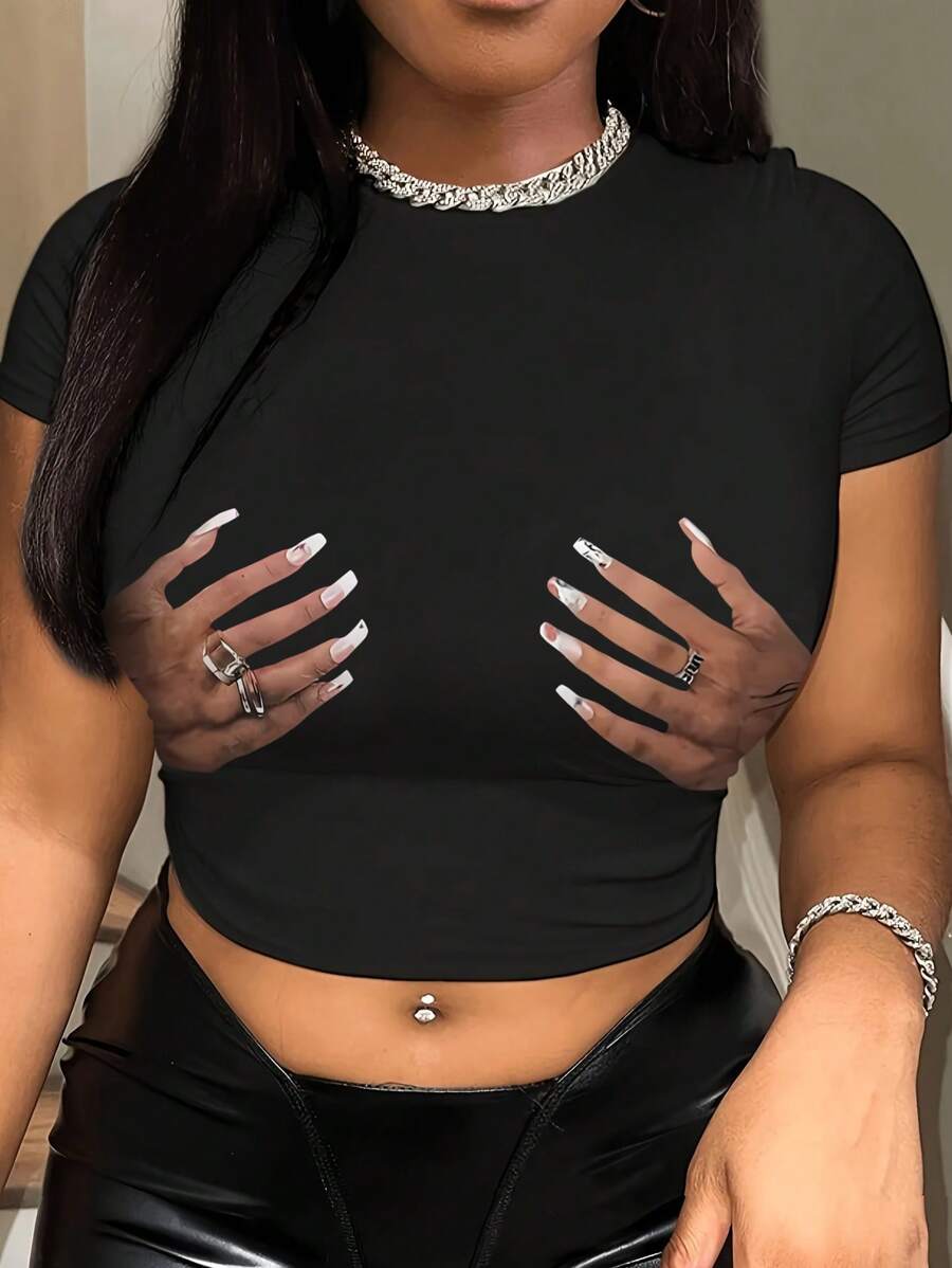 تي شيرت INAWLY نسائي بأكمام قصيرة ورقبة دائرية مطبوع يدويًا قماش شبكي متباين مطاط قليلاً