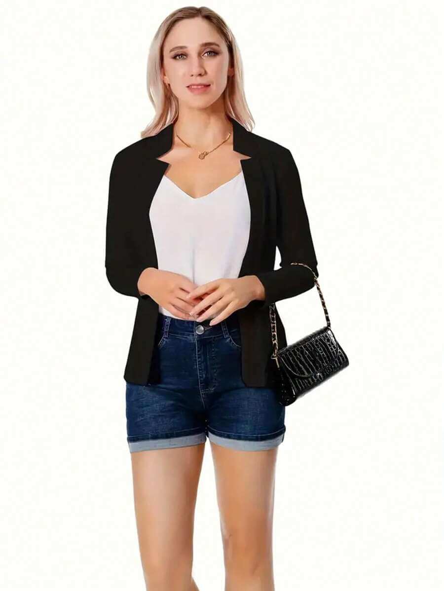 بليزر سوداء ذات تصميم بسيط وأنيق بدون أزرار. تحتها، ترتدي بلوزة بيضاء بدون أكمام وبياقة على شكل "V".