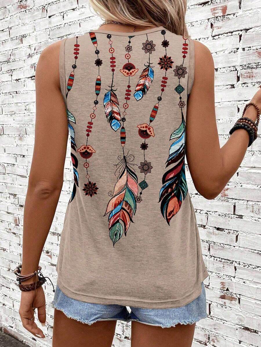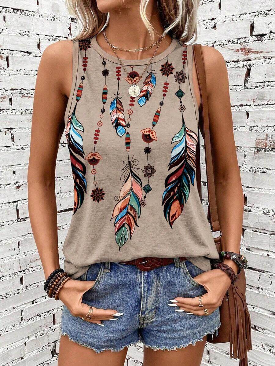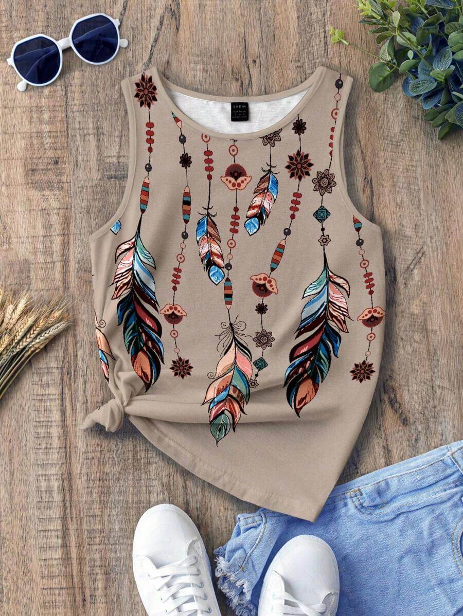 توب أنيق بأسلوب بوهيمي عصري يمنحك مظهرًا مميزًا ومريحًا في آنٍ واحد. يتميز بتصميم بلا أكمام مع ياقة دائرية بسيطة، مزين بطبعة ريش ملونة تضيف لمسة فنية مبهجة إلى الإطلالة. خامته ناعمة وخفيفة على البشرة، مما يجعله خيارًا مثاليًا لأيام الصيف أو الإطلالات الكاجوال مع شورت جينز أو بنطال واسع.
