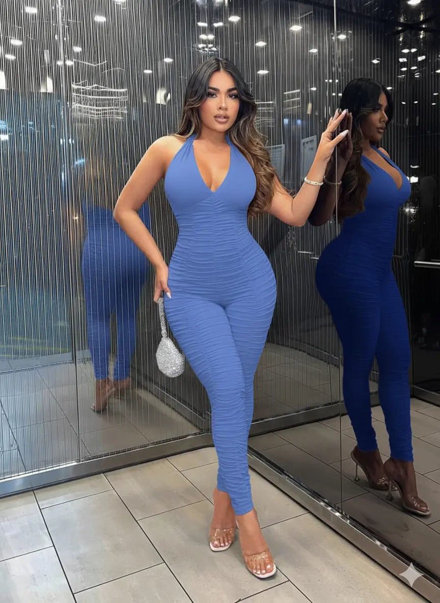 للحفلات والمهرجانات. يتميز بتصميم هالتر بدون أكمام وظهر مكشوف يبرز أنوثتك بجرأة، مع لمسات مكشكشة وعقدة أنيقة تضيف لمسة من التفرّد.