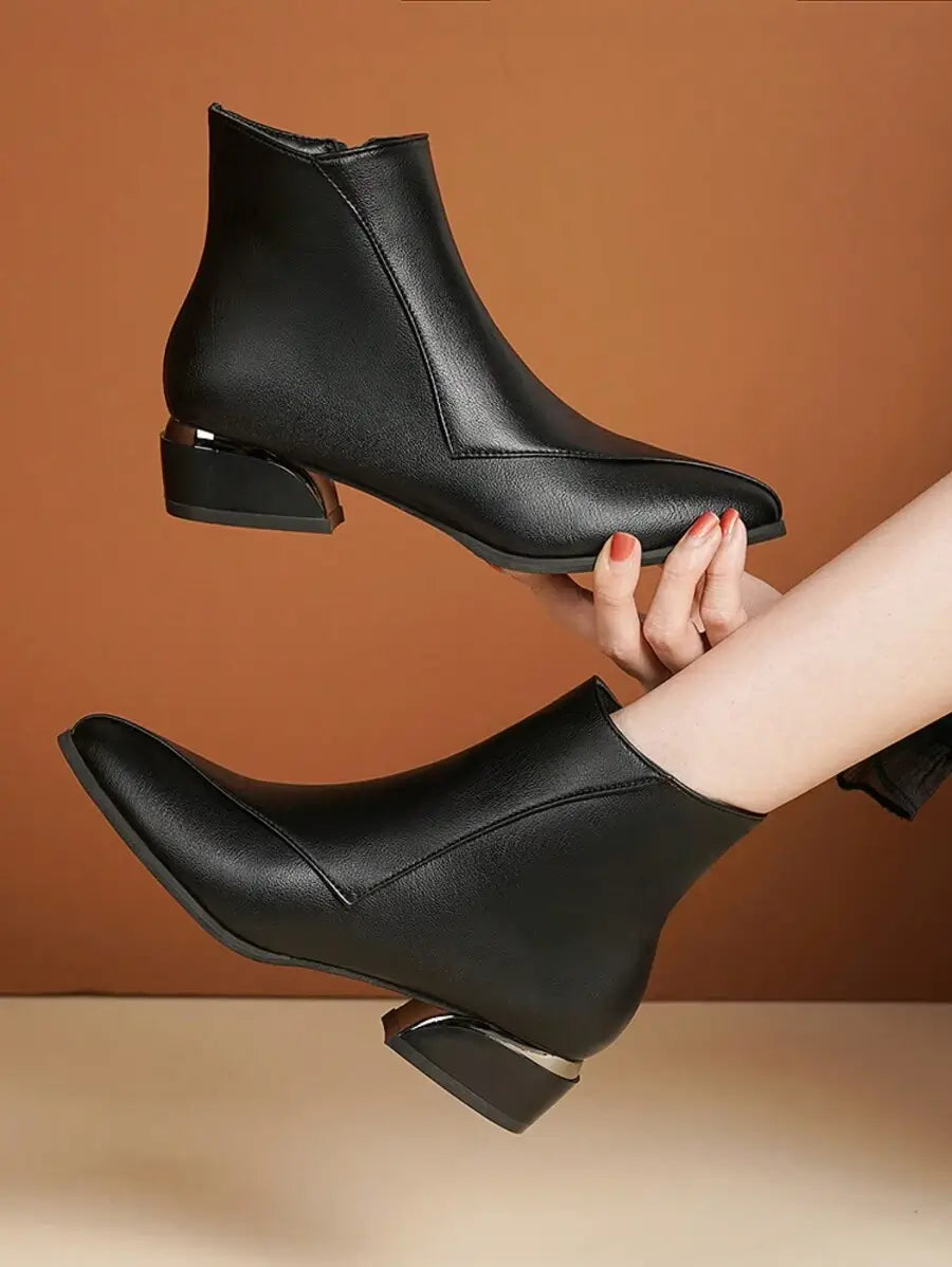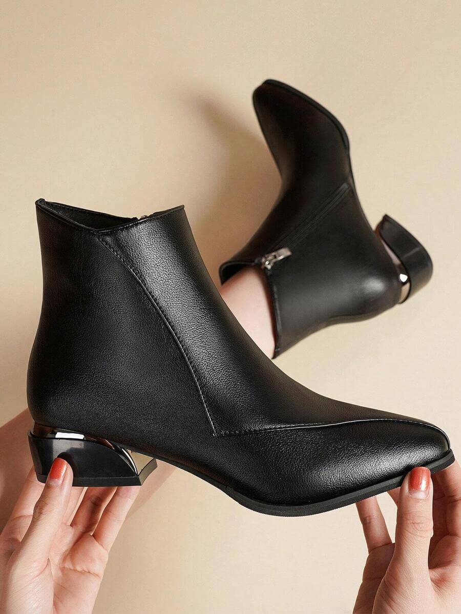 حذاء تشيلسي مسطح أنيق للنساء لفصل الخريف/الشتاء مصنوع من الجلد الأسود بسمك 4 سم ومقدمة مدببة وكعب سميك لامع وسحاب جانبي