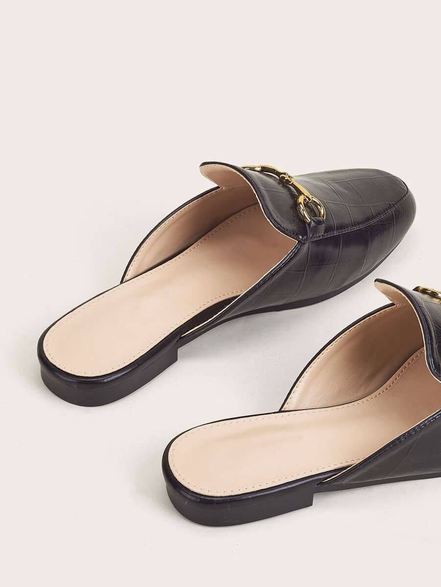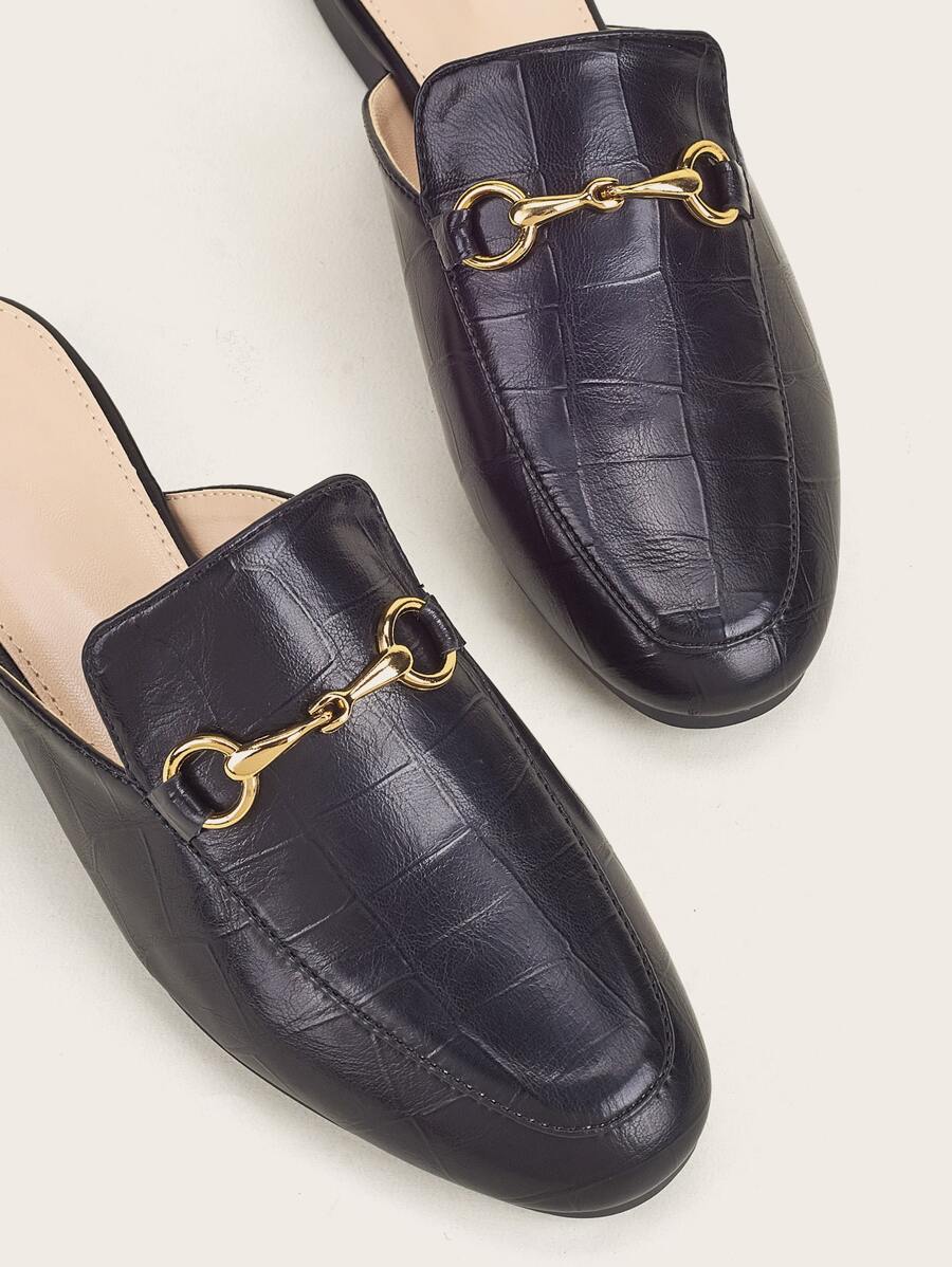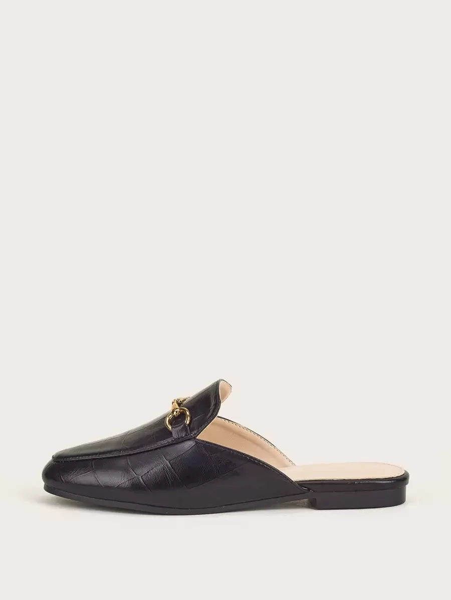حذاء نسائي بتصميم كلاسيكي مفتوح من الخلف، مصنوع من خامة جلد صناعي بنقشة خفيفة تشبه جلد التمساح. الجزء الأمامي مزين بتفصيلة معدنية باللون الذهبي تضيف لمسة بسيطة وأنيقة. النعل منخفض ومناسب للاستخدام اليومي أو الإطلالات الرسمية البسيطة.