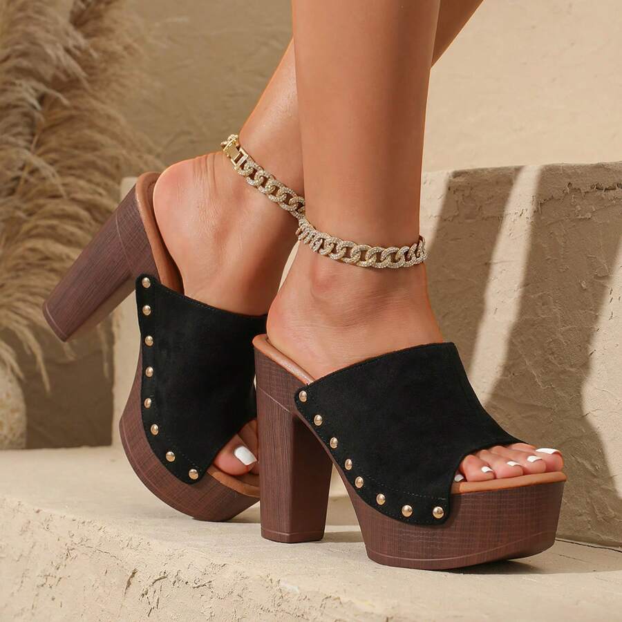 حذاء نسائي مصنوع من خامة جلد لامع بتصميم مفتوح من الخلف وكعب مرتفع رفيع. المقدمة مدببة، والجزء العلوي مزين بأحزمة رفيعة مع حلقات معدنية صغيرة لإضافة تفصيل بسيط. مناسب للإطلالات الرسمية أو السهرات المسائية.