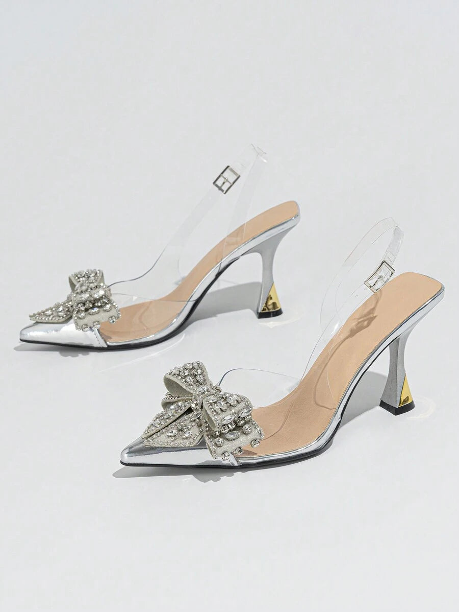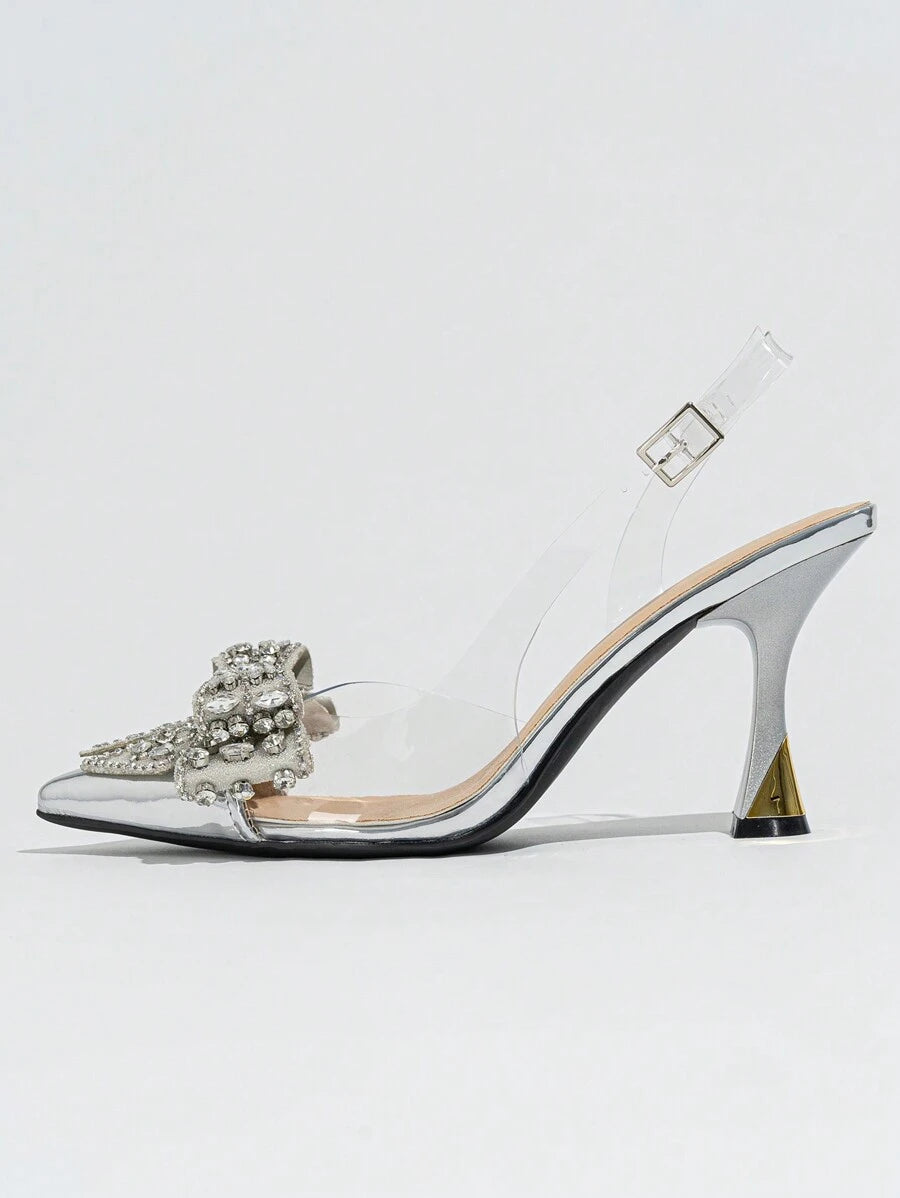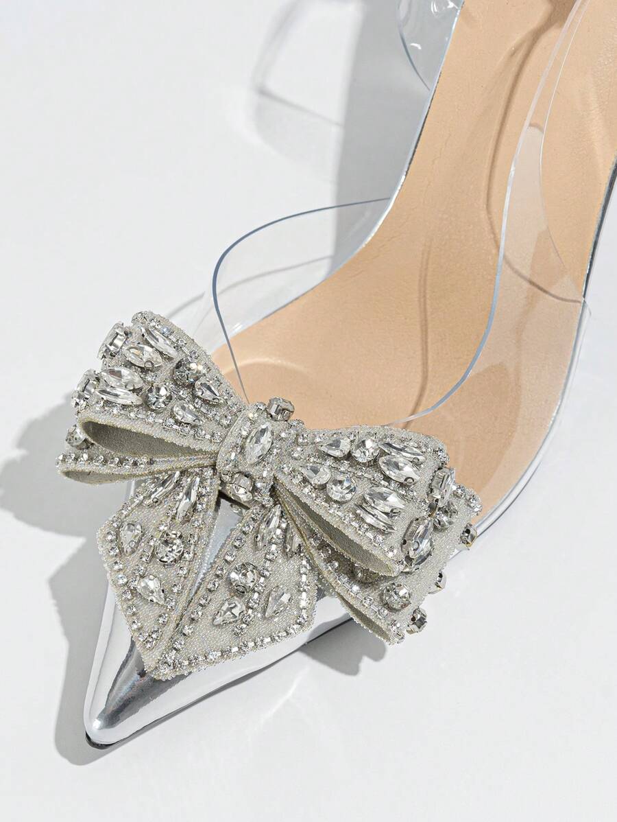 حذاء نسائي بكعب عالٍ من مادة البولي فينيل كلوريد بمقدمة مدببة مزين بعقدة من أحجار الراين