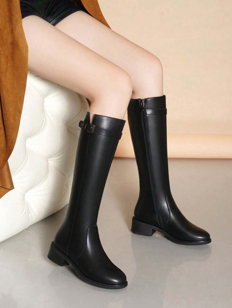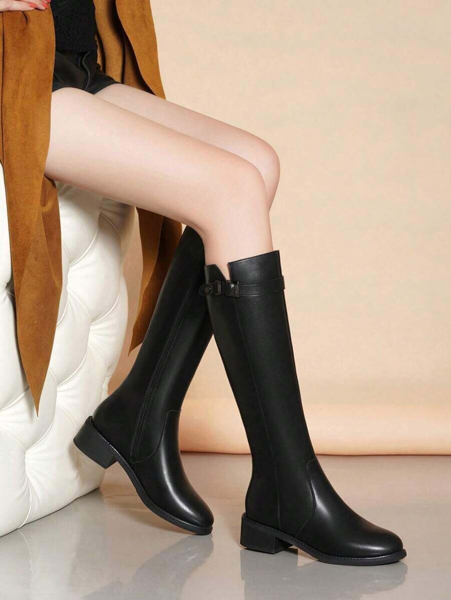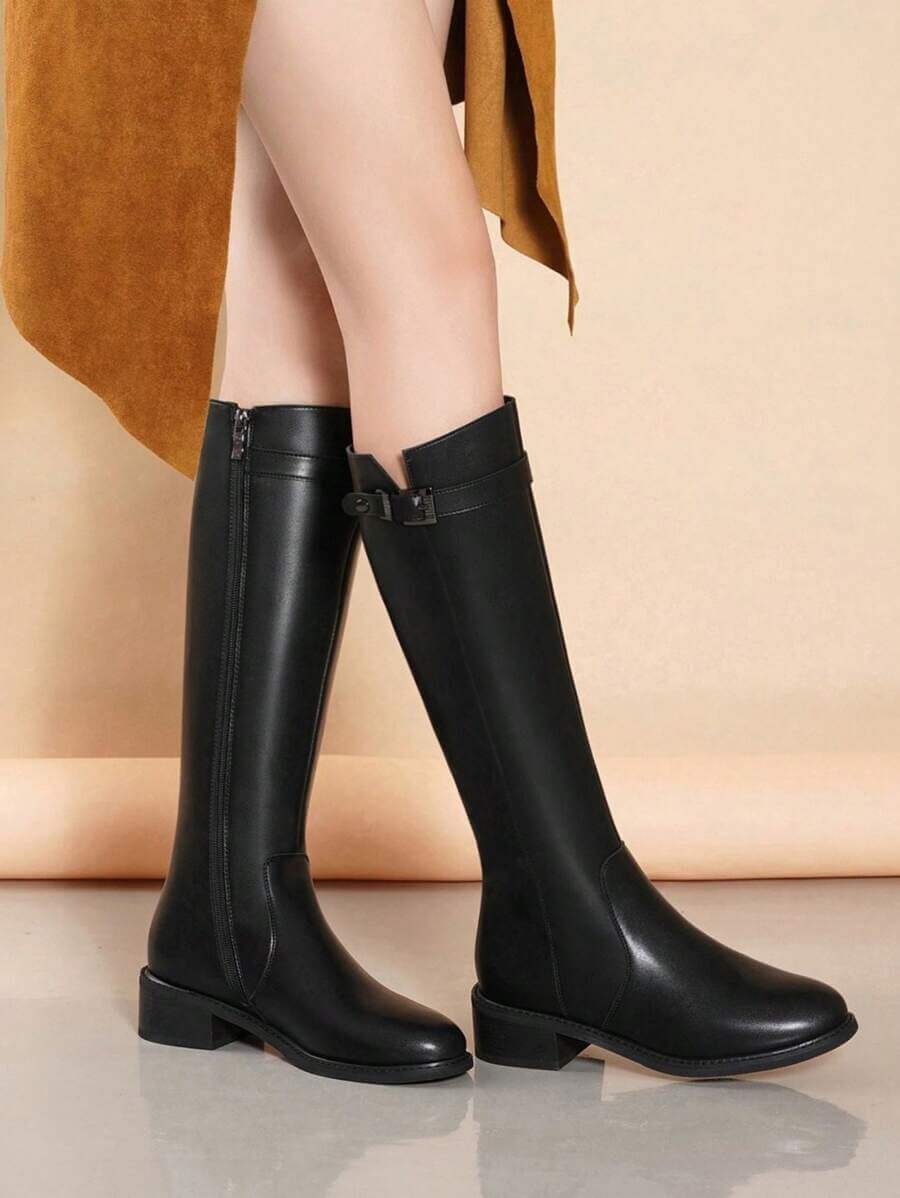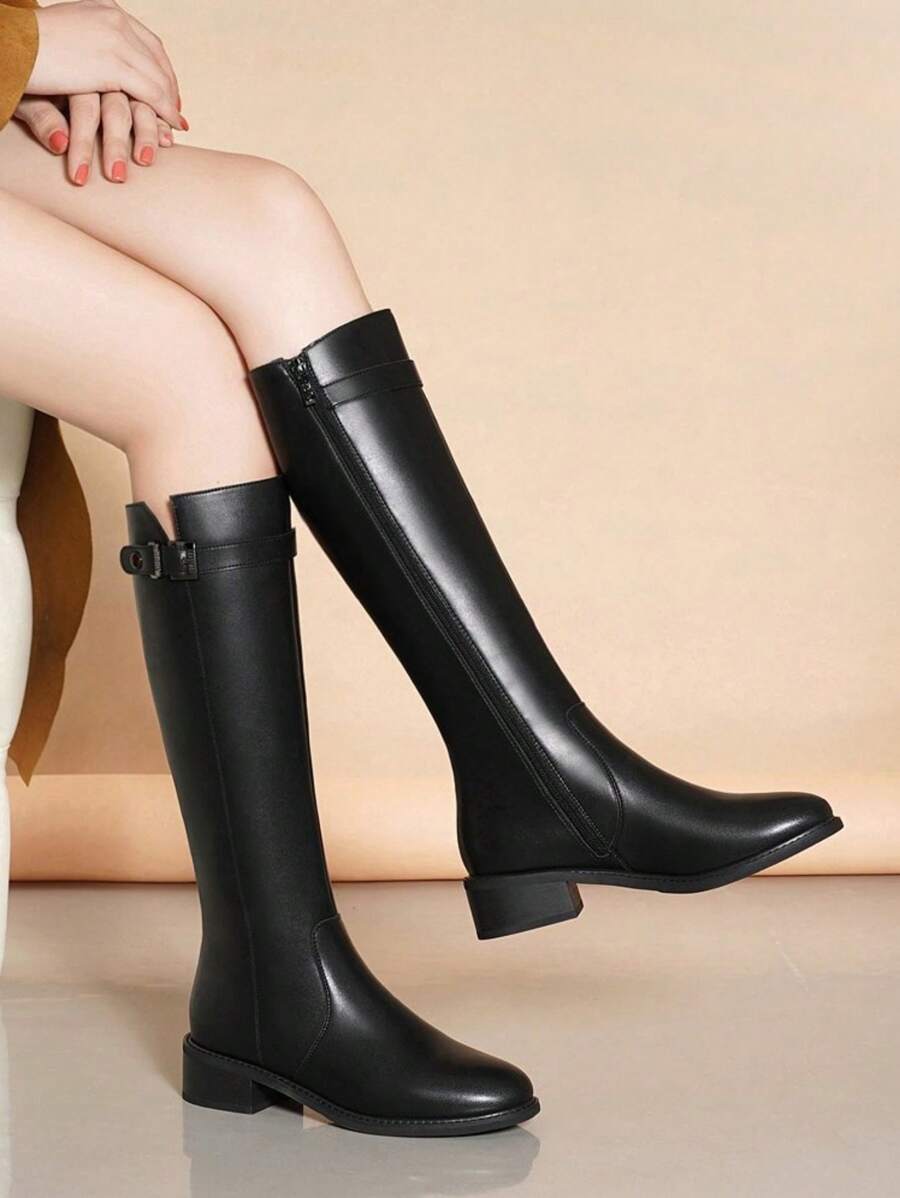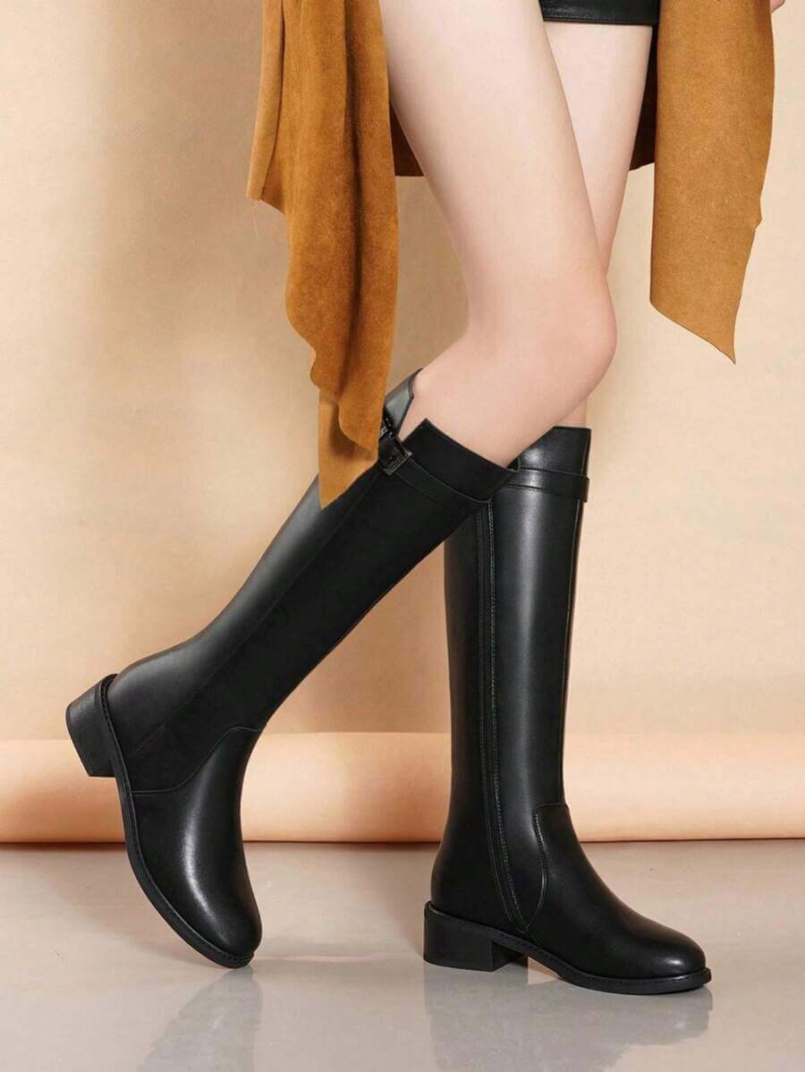 بوت مصنوع من خامة جلد صناعي ناعمة باللون الأسود، بتصميم طويل يصل إلى منتصف الساق. يحتوي على سحاب جانبي لسهولة الارتداء، مع حزام صغير بتفصيلة معدنية عند الجزء العلوي. الكعب متوسط الارتفاع والنعل ثابت ومناسب للاستخدام اليومي في الأجواء الباردة