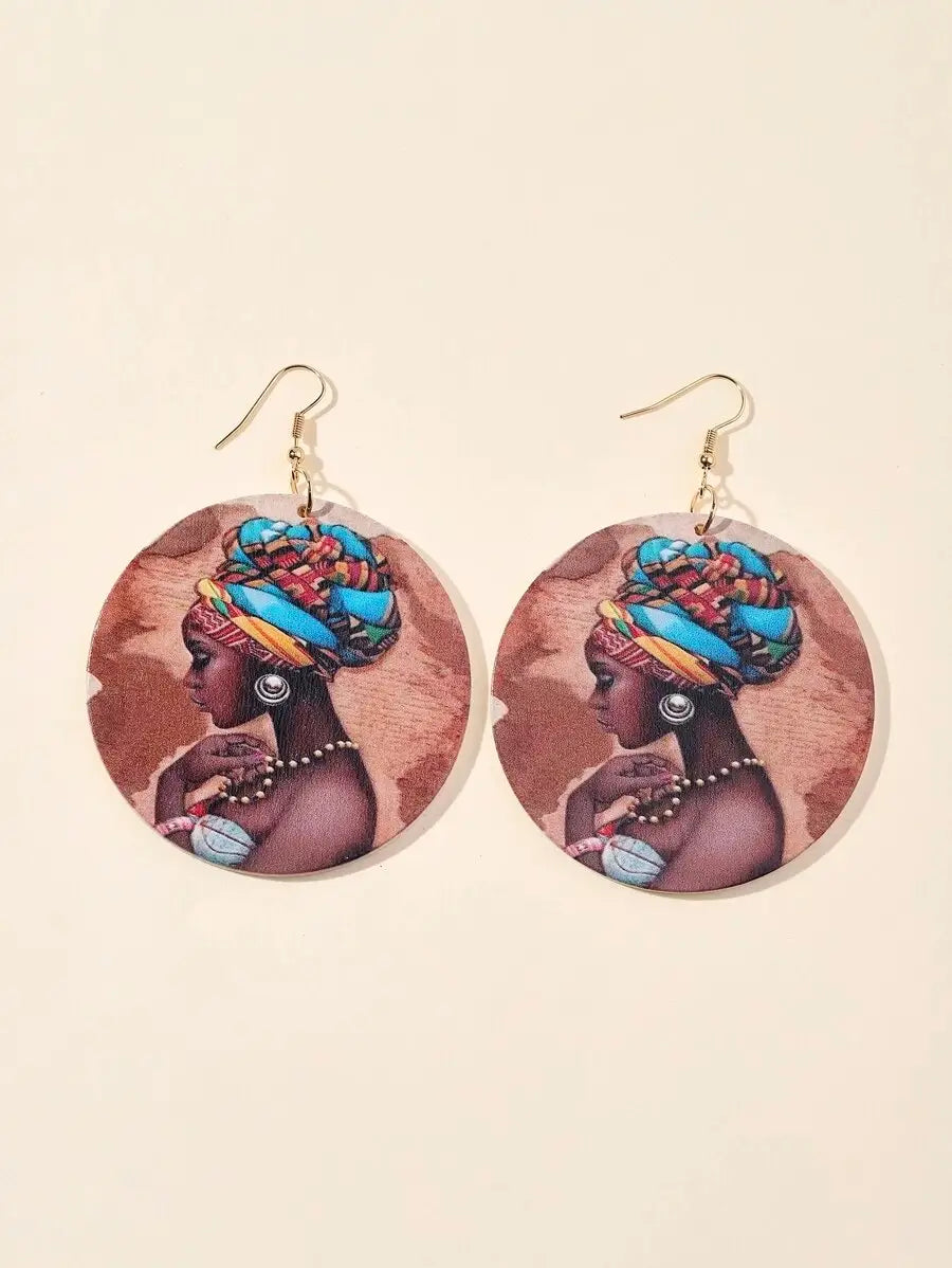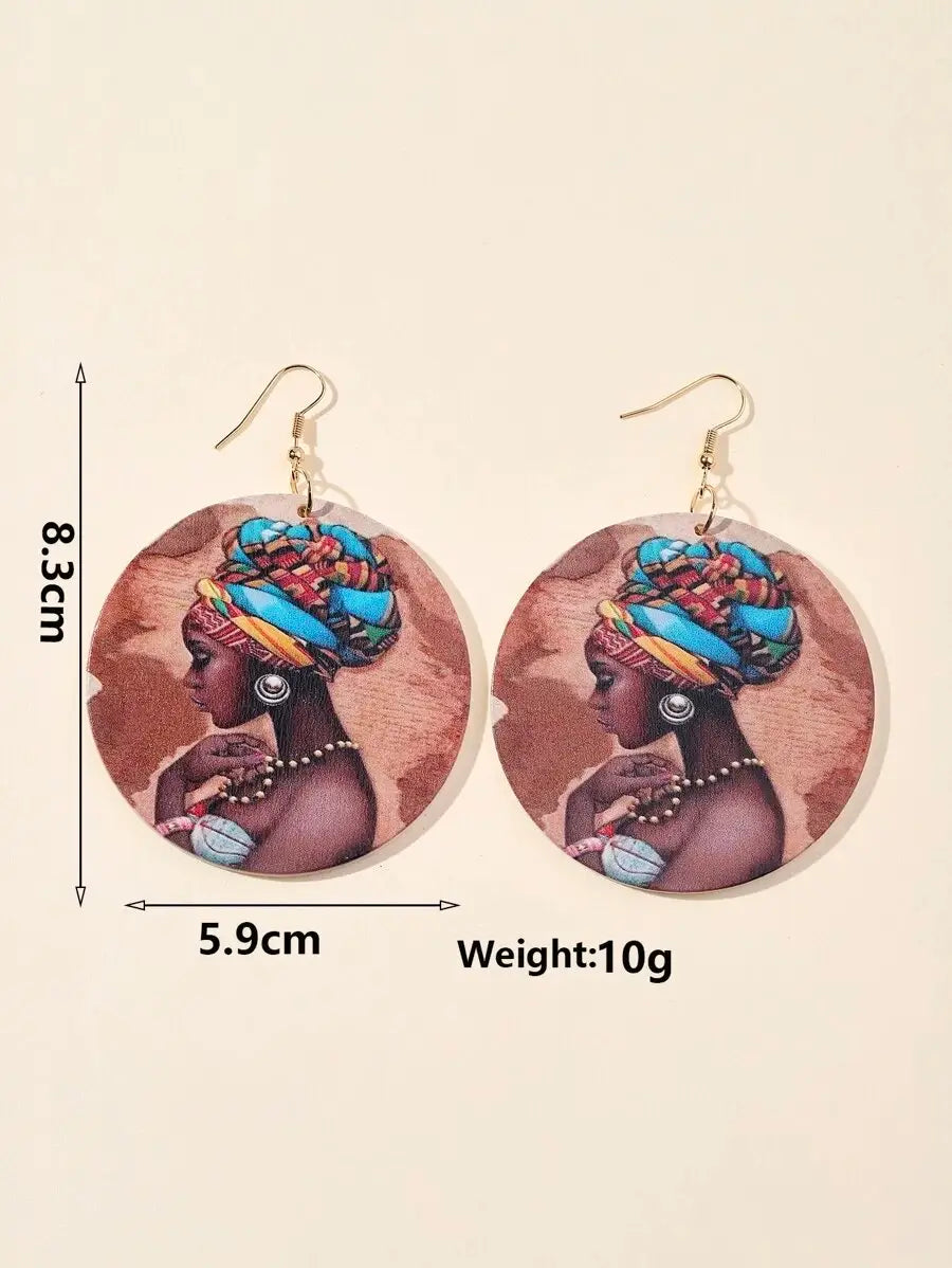 أقراط فريدة مستوحاة من الفن الأفريقي المعاصر، بتصميم دائري كبير يبرز طباعة لامرأة ترتدي إيشاربًا ملونًا بألوان زاهية ولمسات فنية جذابة. تعكس روح الأصالة والجمال الثقافي بطريقة أنيقة وغير تقليدية، مما يجعلها قطعة مثالية لعاشقات التميز والإطلالات الجريئة ذات الطابع الفني.
