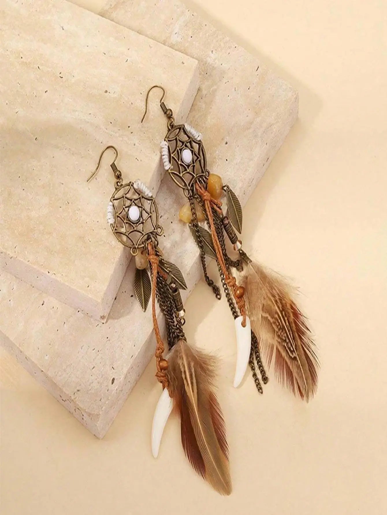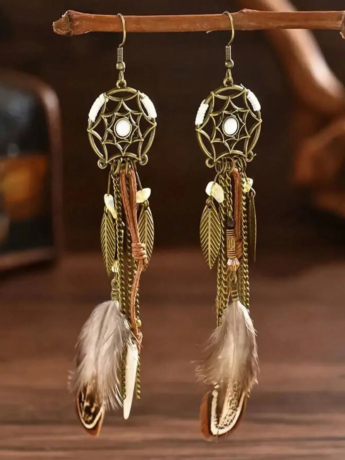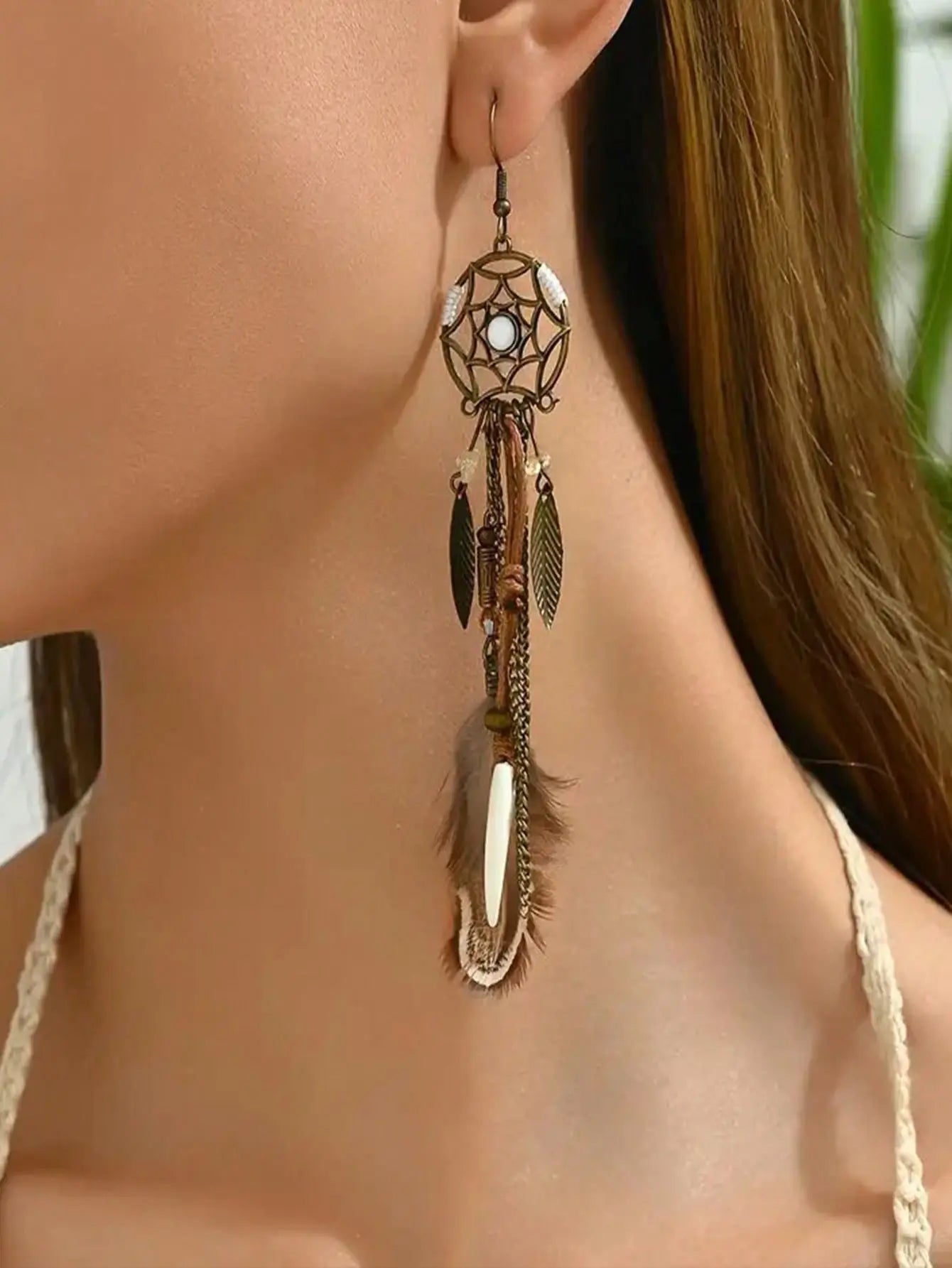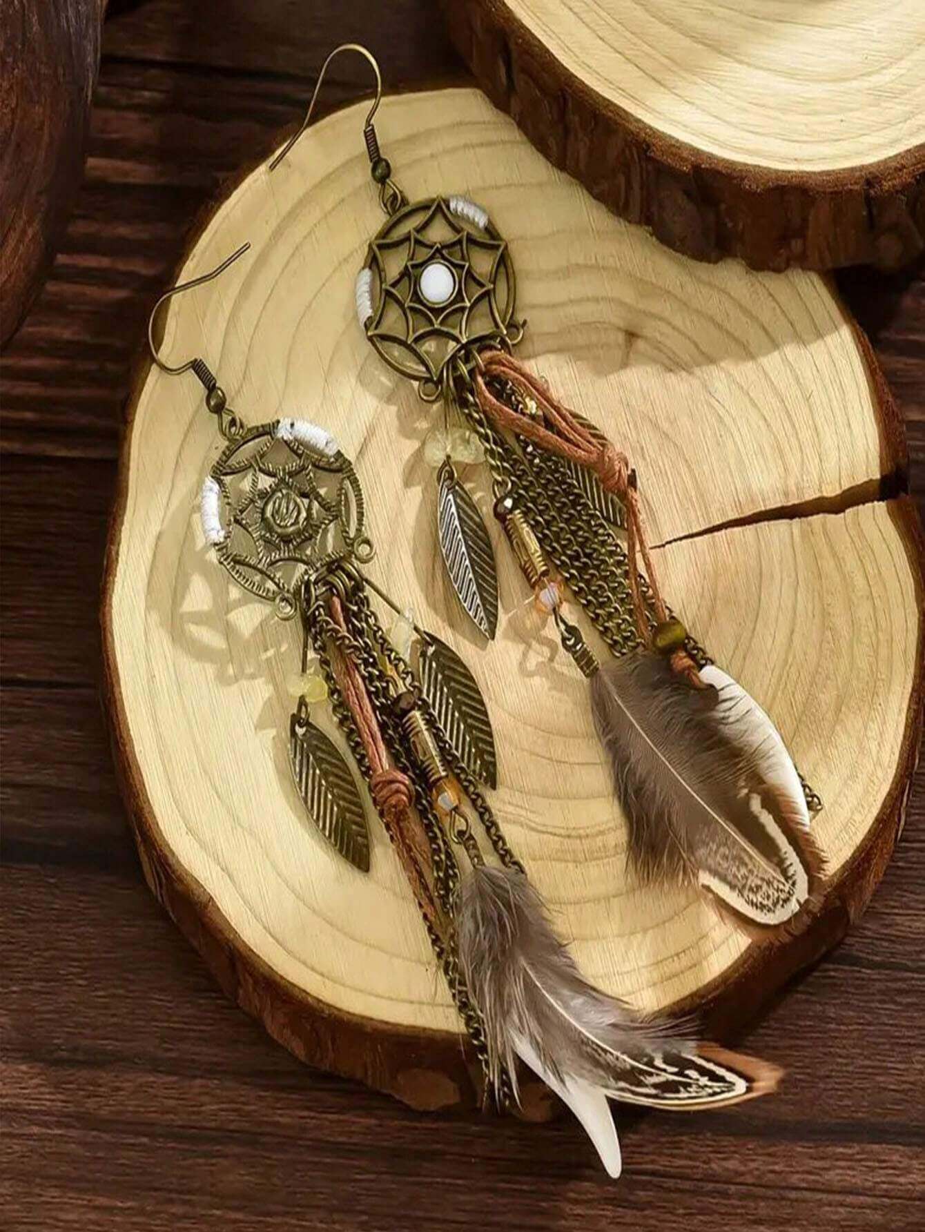 زوج واحد من الأقراط المتدلية المصنوعة يدويًا من الريش الطبيعي بتصميم ماسك الأحلام البوهيمي للنساء