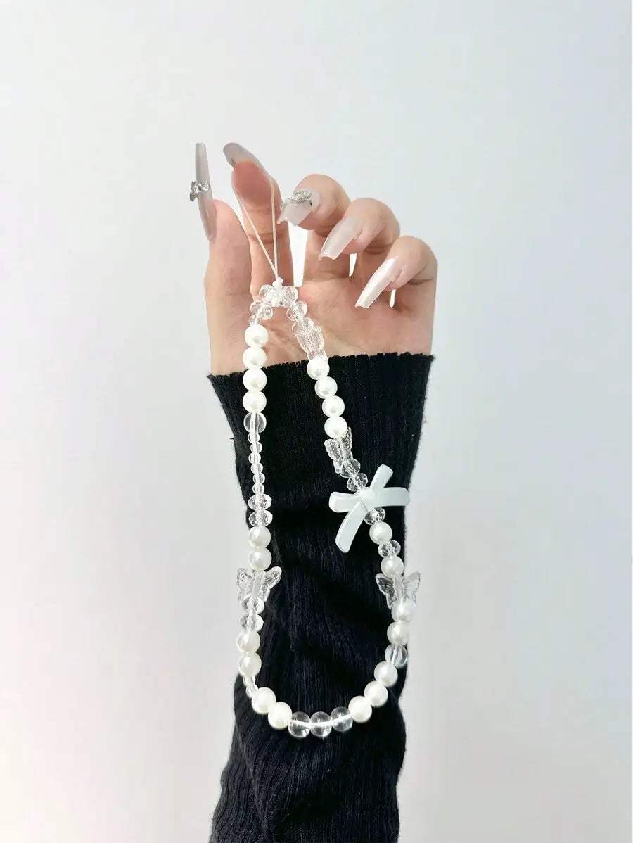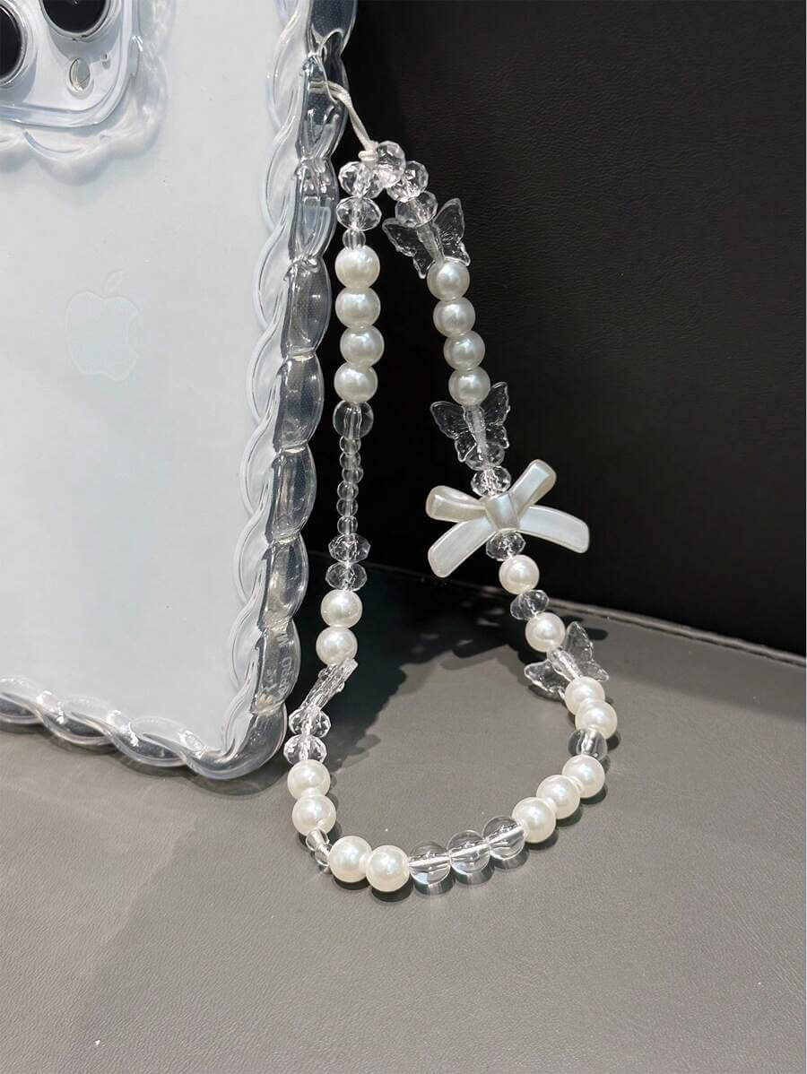 سوار زينة هاتف على شكل فيونكة لؤلؤية مع سلسلةلون ابيض حمايه للهاتف