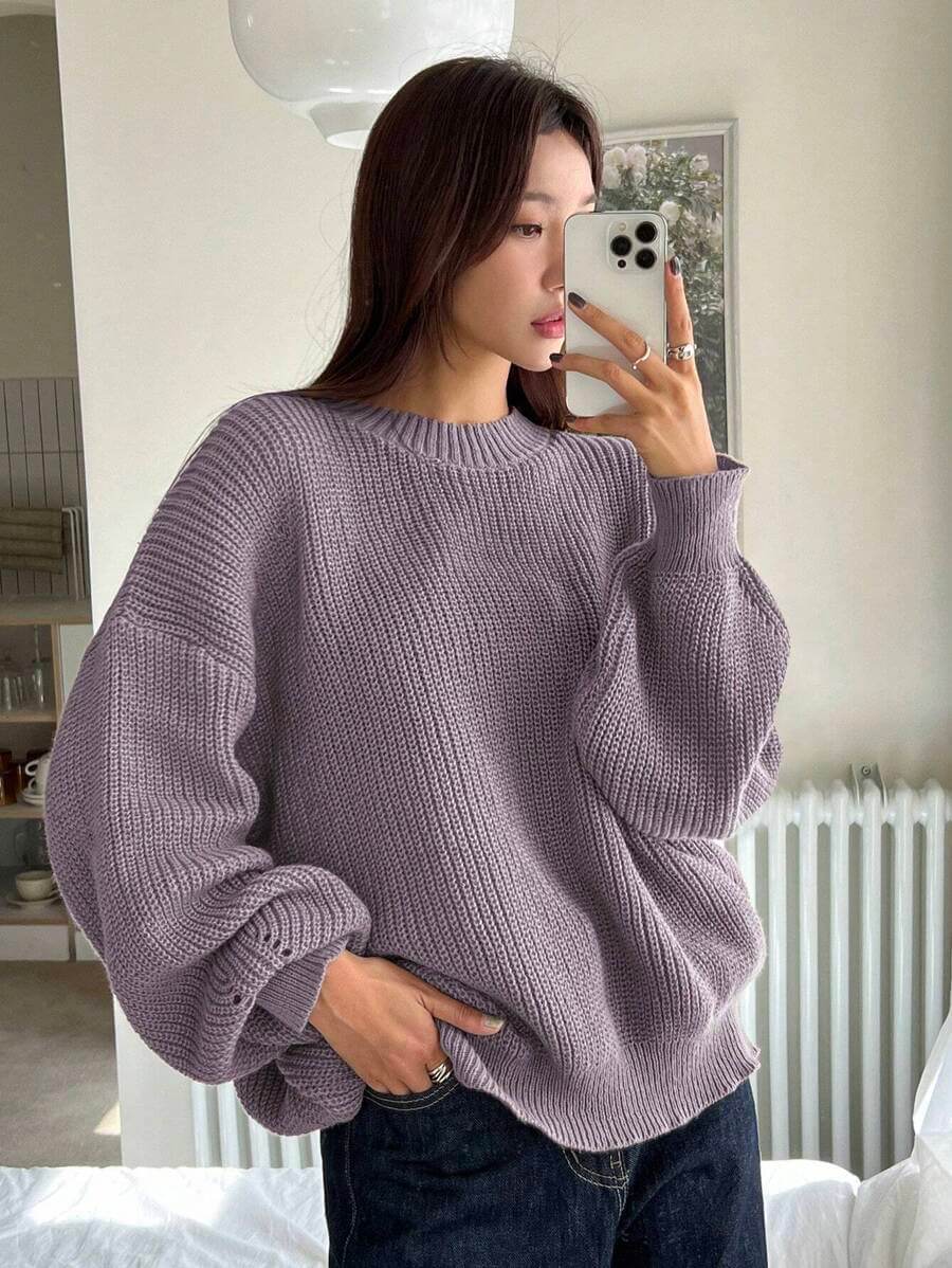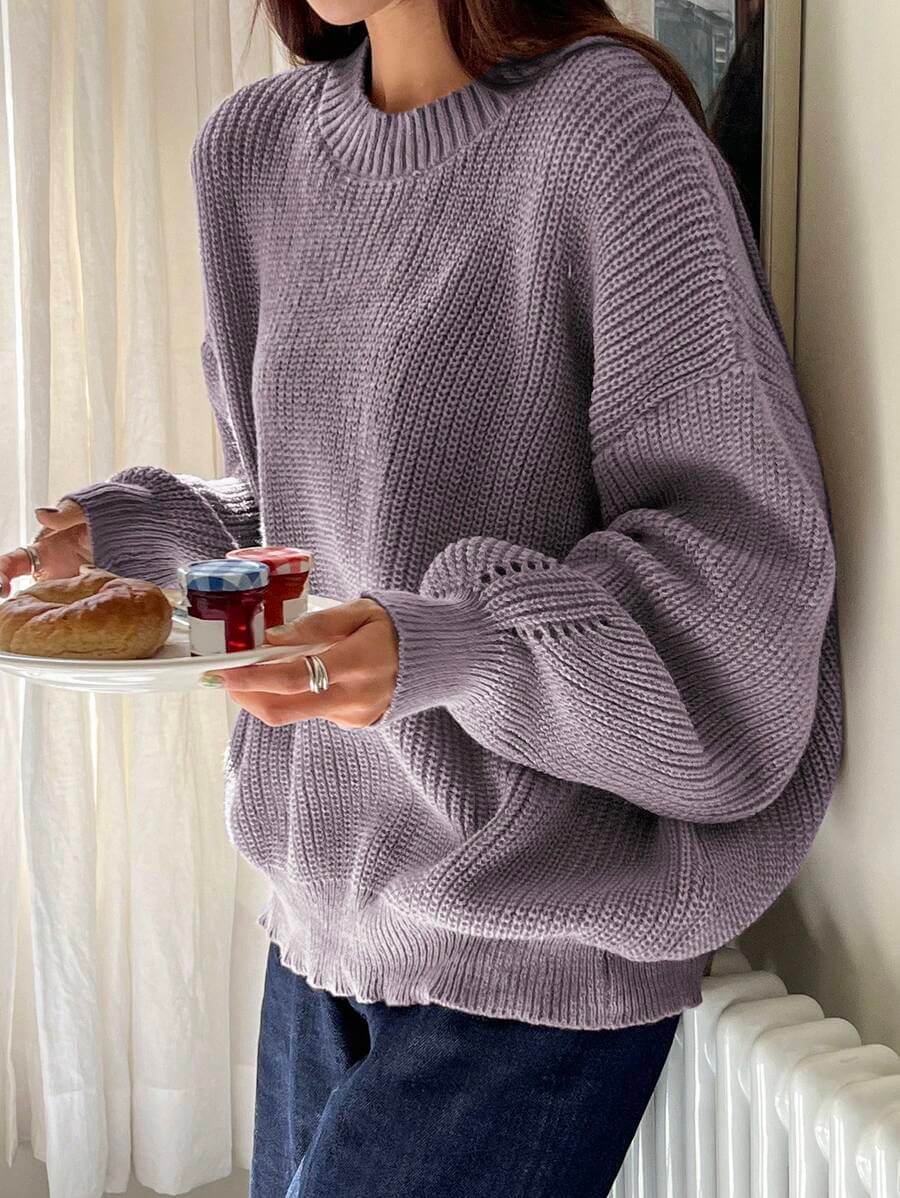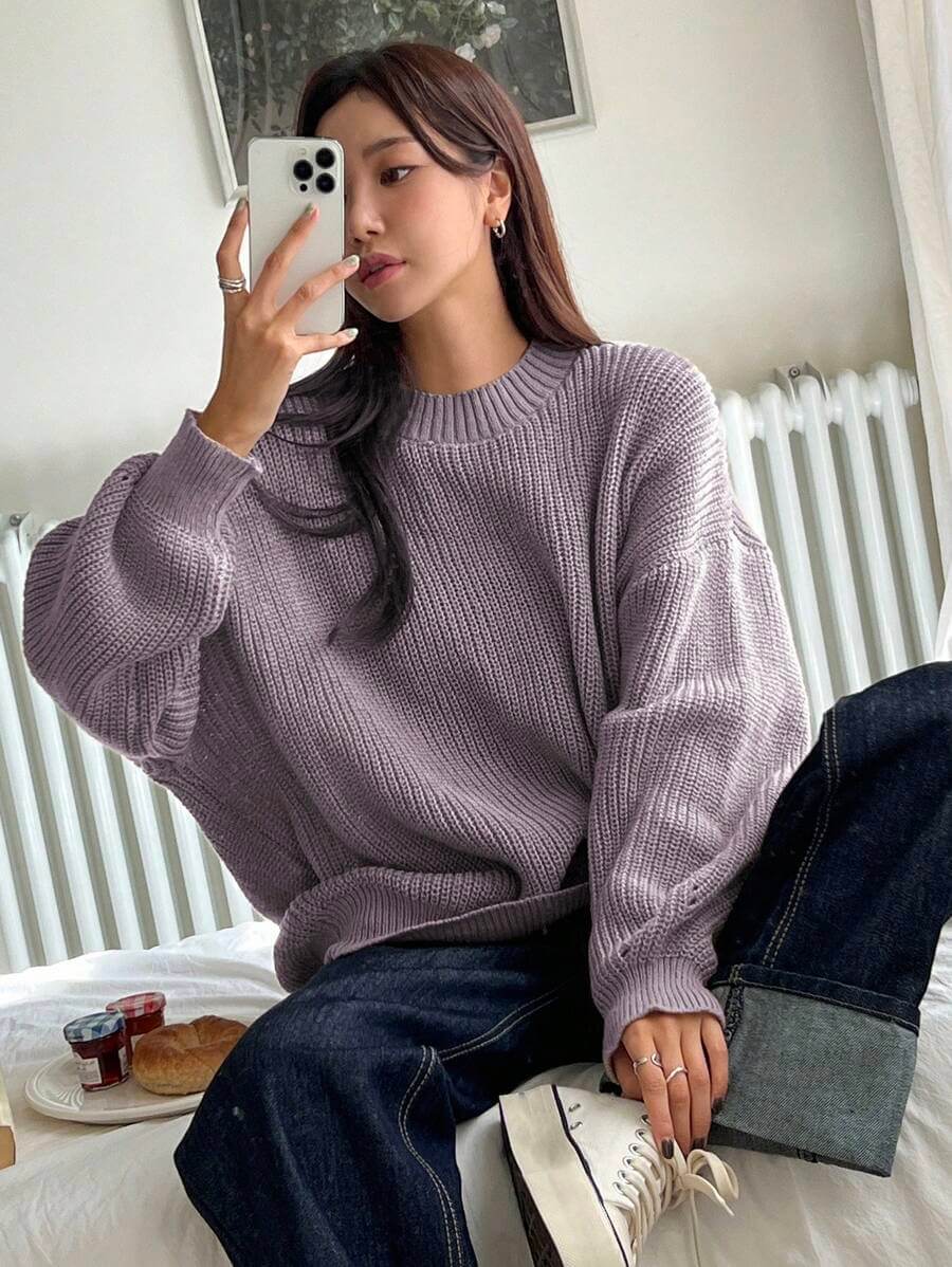 بلوزة منسوجة بخيوط سميكة بتصميم بسيط بلون بنفسجي هادئ. القماش ناعم ومرن بملمس مريح، والأكمام المنسدلة بتضيف لمسة استرخاء للتصميم. البلوزة بتتميز بقَصّة فضفاضة ومريحة تناسب الإطلالات اليومية البسيطة، وسهلة التنسيق مع الجينز أو البنطال القماشي.