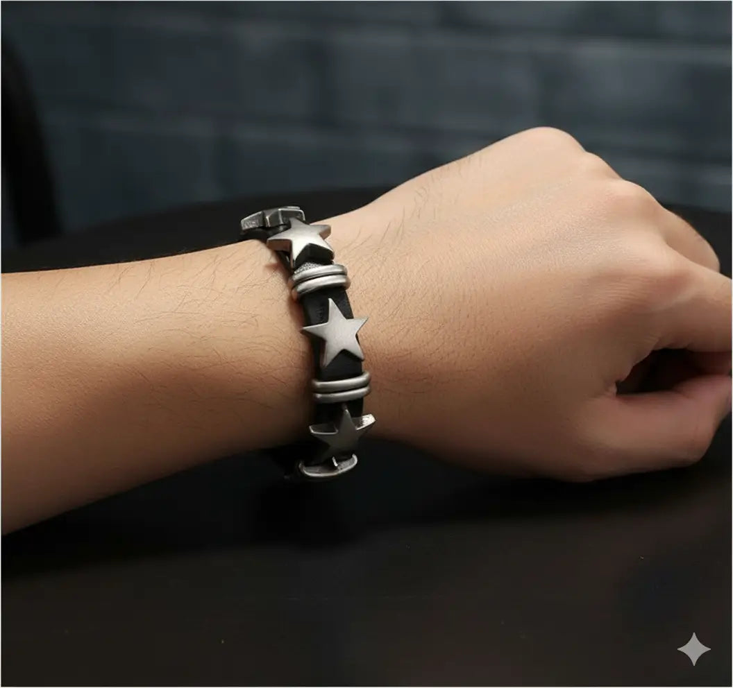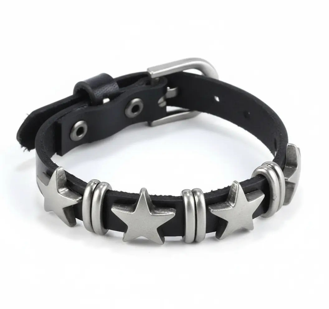 سوار أنيق مصنوع من الجلد الصناعي باللون الأسود، يتميز بتصميم عصري مزين بنجوم معدنية فضية تضيف لمسة من الجرأة والأناقة. مزود بإبزيم معدني لتعديل المقاس بسهولة، مما يجعله مناسبًا لمختلف المقاسات والإطلالات اليومية. تصميمه البسيط والمميز يجعله إضافة مثالية لإطلالة عصرية متوازنة.