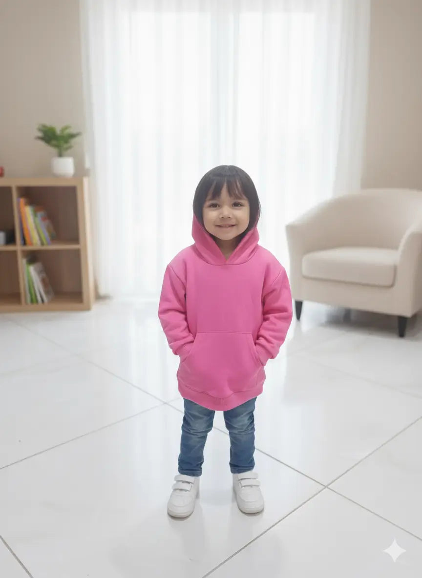 سويت شيرت للأطفال بعمر ٤ سنوات، مصمم بلون وردي سادة مع غطاء رأس عملي. يتميز بخامة قطنية ناعمة وأكمام طويلة مع أساور مطاطية لراحة أكبر. يأتي بجيب أمامي كبير لمزيد من العملية، مما يجعله مناسب للارتداء اليومي في الأجواء المعتدلة والباردة.