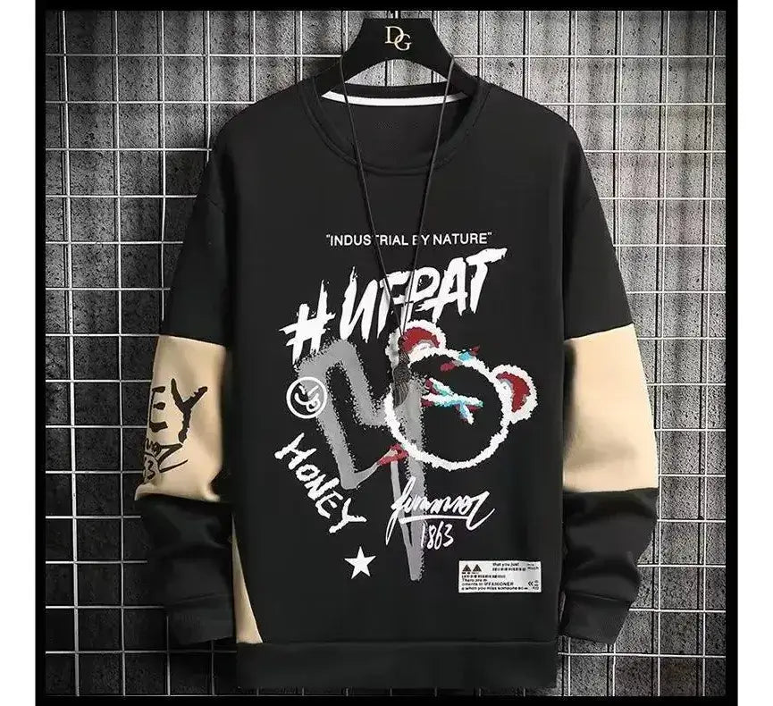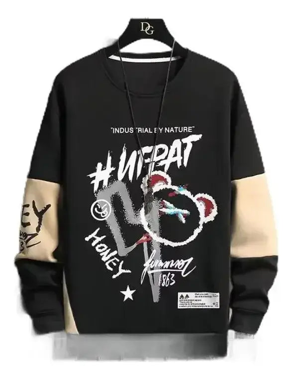 سويت شيرت رجالي بتصميم عصري باللون الأسود مع أكمام متباينة باللون البيج. مزود بطبعات جرافيك كبيرة في الأمام تشمل أشكال ورسومات متنوعة تضيف لمسة شبابية. يتميز بقصة واسعة وأكمام طويلة مع أساور مطاطية، وخامة مريحة مناسبة للأجواء الباردة.