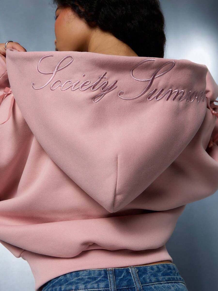 سويت شيرت SUMWON WOMEN Society قصير بأكمام شريطية وشعار مطرز وسحاب أمامي وتفاصيل فيونكة