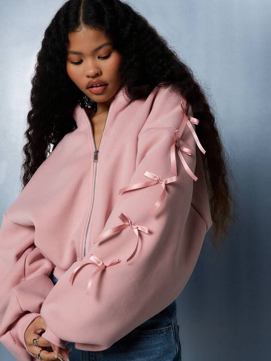 جاكيت بلون وردي ناعم بتصميم فضفاض وأكمام واسعة مزينة بشرائط ساتان على الجانبين تضيف لمسة أنثوية بسيطة. يتميز بسحّاب أمامي لسهولة الارتداء وقَصّة قصيرة تمنح مظهر عصري وغير رسمي. خامته مريحة ومثالية للأجواء المعتدلة.