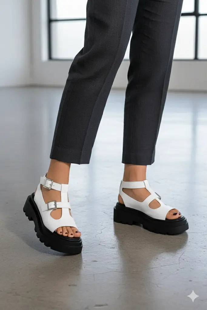 صندل نسائي أنيق بتصميم عصري يجمع بين الراحة والستايل. مصنوع من خامة جلد صناعي لامعة باللون الأبيض مع نعل مرتفع باللون الأسود لإطلالة ملفتة. يتميز بأشرطة قابلة للتعديل مع إبزيم معدني يمنحك ثباتًا أثناء الحركة، مما يجعله مناسب للارتداء اليومي أو الخروجات الكاجوال. تصميمه البسيط مع التفاصيل العصرية يجعله قطعة مثالية للتنسيق مع البنطلونات أو الفساتين الصيفية.