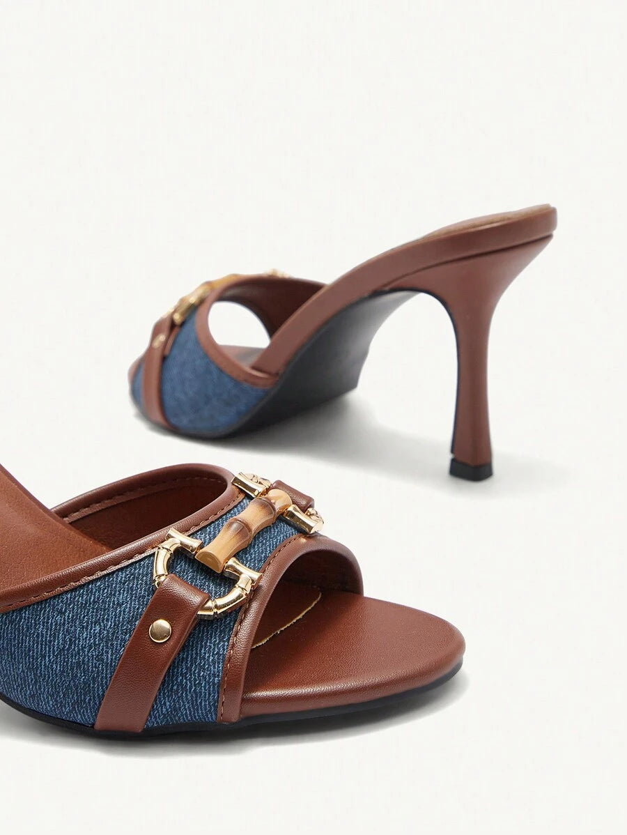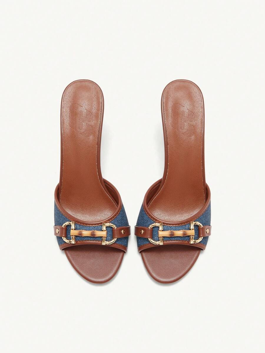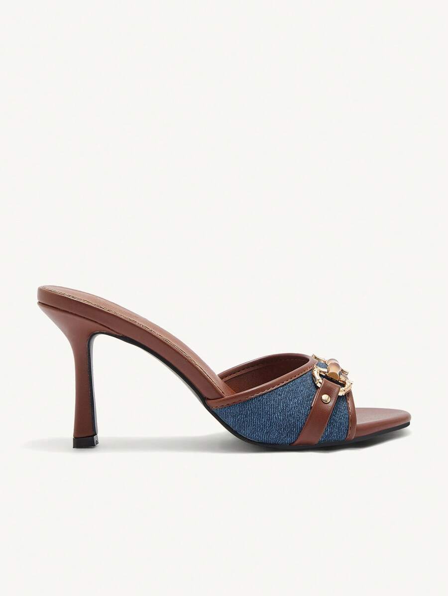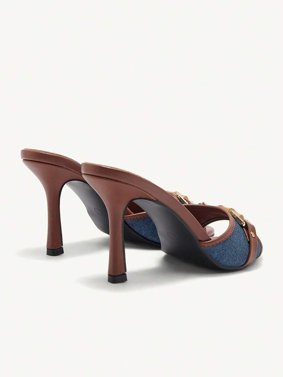 كعب نسائي بتصميم مفتوح من الأمام، يجمع بين خامة الجينز الأزرق والجلد الصناعي البني. الجزء العلوي مزين بتفصيلة معدنية بسيطة باللون الذهبي، والكعب متوسط الارتفاع بشكل رفيع. تصميمه يجمع بين الطابع الكاجوال والأنيق في نفس الوقت.