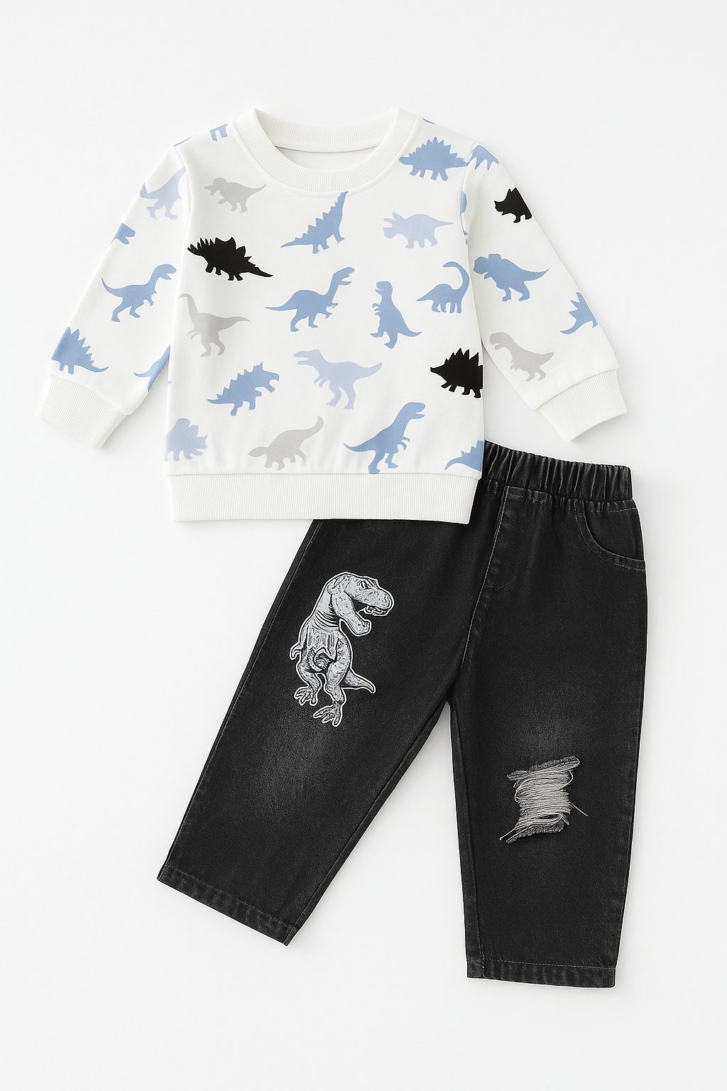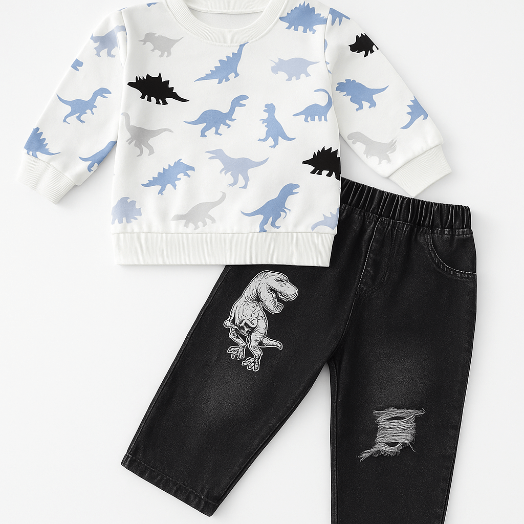 طقم أطفال شتوي أنيق ومرح يجمع بين الراحة والعصرية، مكون من سويت شيرت أبيض مطبوع بأشكال ديناصورات بألوان جذابة تضيف لمسة مرحة، مع بنطال أسود بخصر مطاطي مريح مزين بتطريز ديناصور بارز وتمزيق خفيف لمظهر عصري. مصنوع من خامات ناعمة ودافئة توفر راحة وحركة سهلة للأطفال